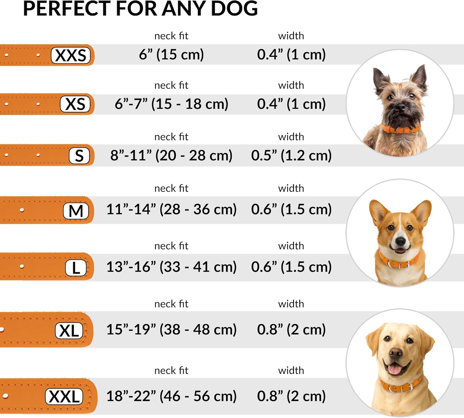 - SUITABLE FOR ALL BREEDS: Our dog collars for small dogs and big dogs come in a variety of sizes. Please check out our size chart before purchasing a leather collar for dogs. The dog collar leather is 0.6 inches wide, 19 inches long, and neck sizes of 15 - 18 inches.