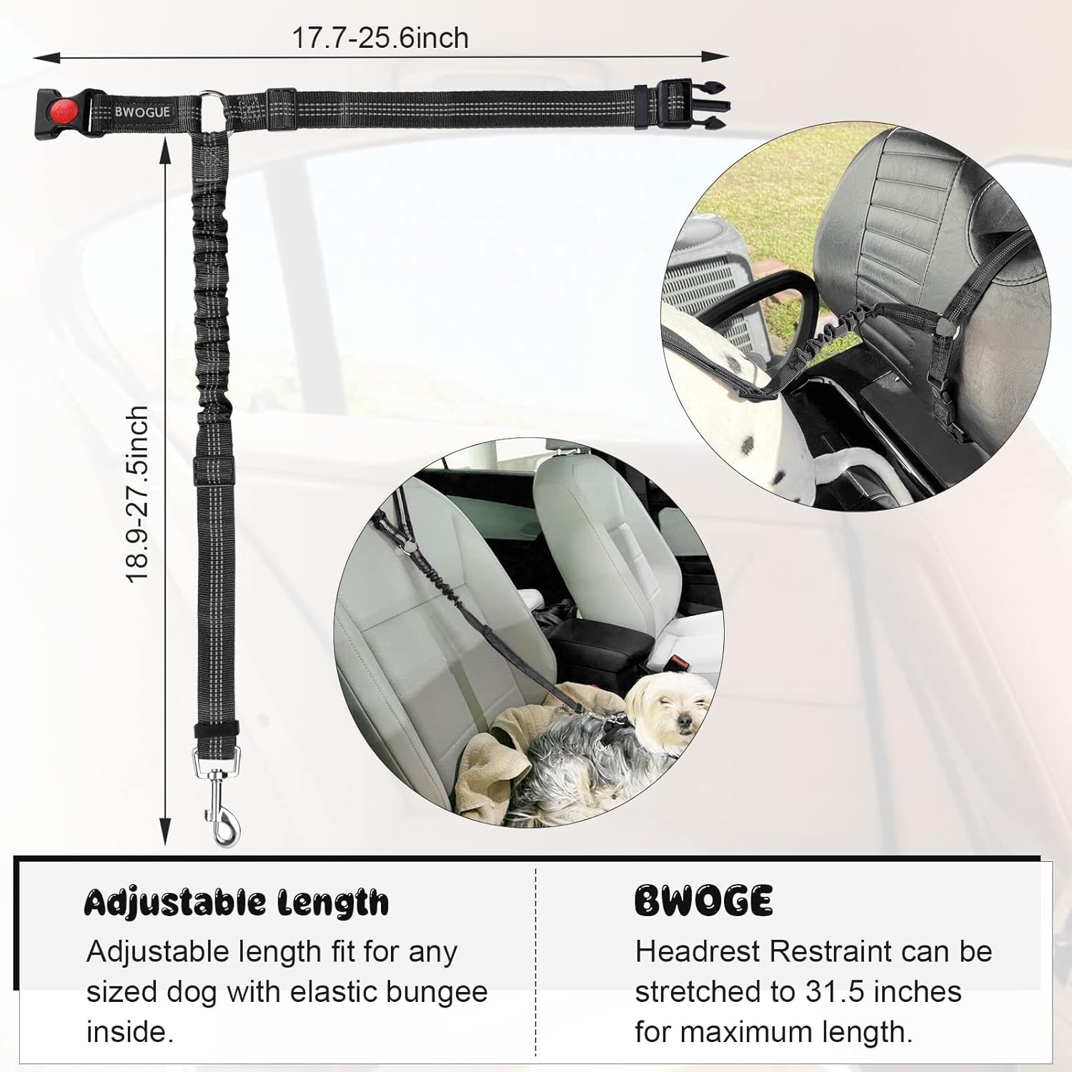 - ADJUSTABLE LENGTH: Dogs come in different sizes and weights. With buckle on the straps and the elastic bungee inside, The BWOGE Headrest Restraint is adjustable between 18.9-27.5 inches and can be stretched to 31.5 inches for the maximum length. The circle can be adjusted from 17.7 inches to 25.6 inches.You can easy to adjust the dog leash to the suitable length to keep your pet in a safety state.