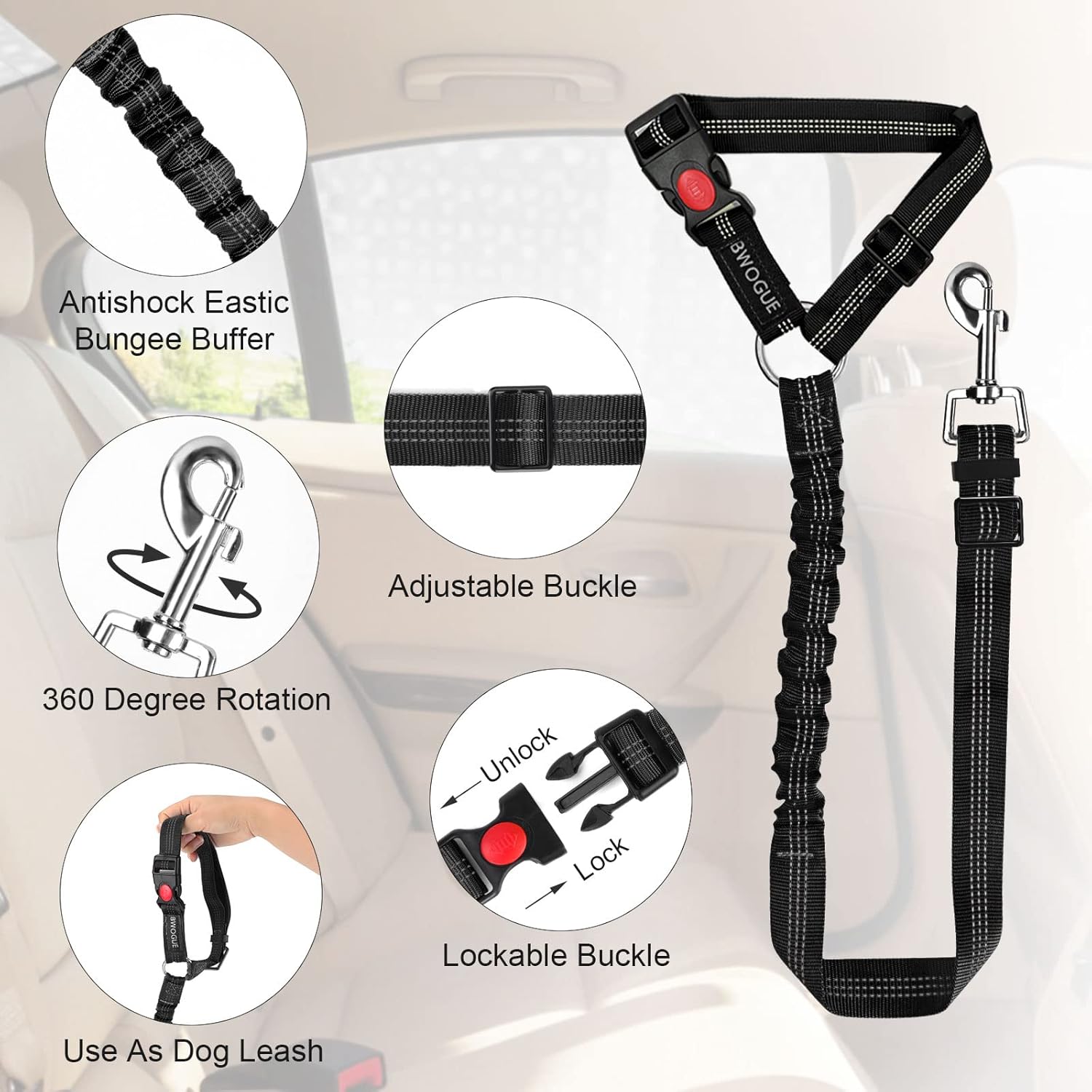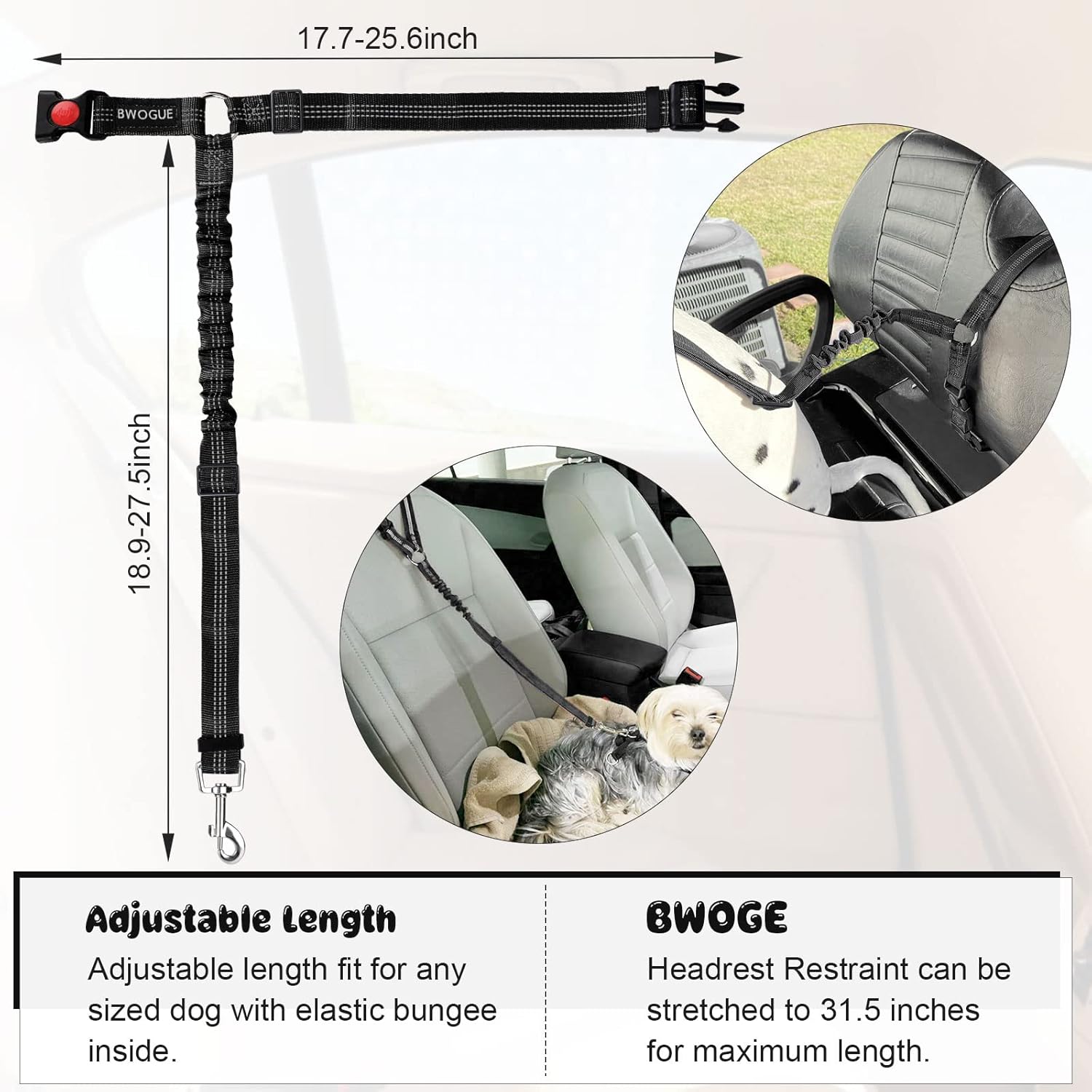- ADJUSTABLE LENGTH: Dogs come in different sizes and weights. With buckle on the straps and the elastic bungee inside, The BWOGE Headrest Restraint is adjustable between 18.9-27.5 inches and can be stretched to 31.5 inches for the maximum length. The circle can be adjusted from 17.7 inches to 25.6 inches.You can easy to adjust the dog leash to the suitable length to keep your pet in a safety state.
