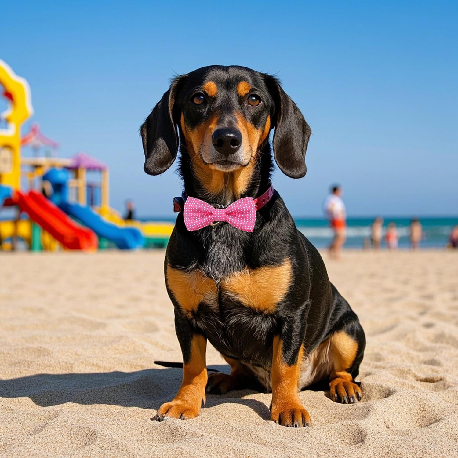 - The collar charms bowties is about 3.8*2 inches. They fit for small and medium dogs, puppies, cats, rabbits and pigs well. The elastic rubber bands on their back usually fit for 1.5-3cm (0.59-1.2inches) wide collars. They can be slipped on collars easily.