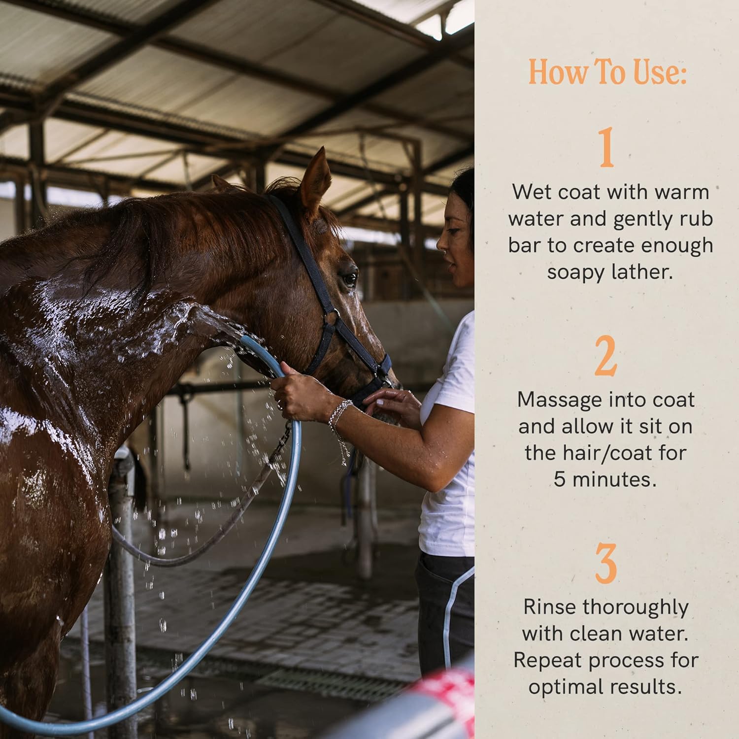 - Specially Formulated for Horses - Whether it’s dust, sweat, or dryness, this horse shampoo bar delivers a deep clean that calms itching, hydrates the coat, neutralizes odors, and includes natural bug-repellent properties making it ideal for horses in turnout, on the trail, or in pasture.