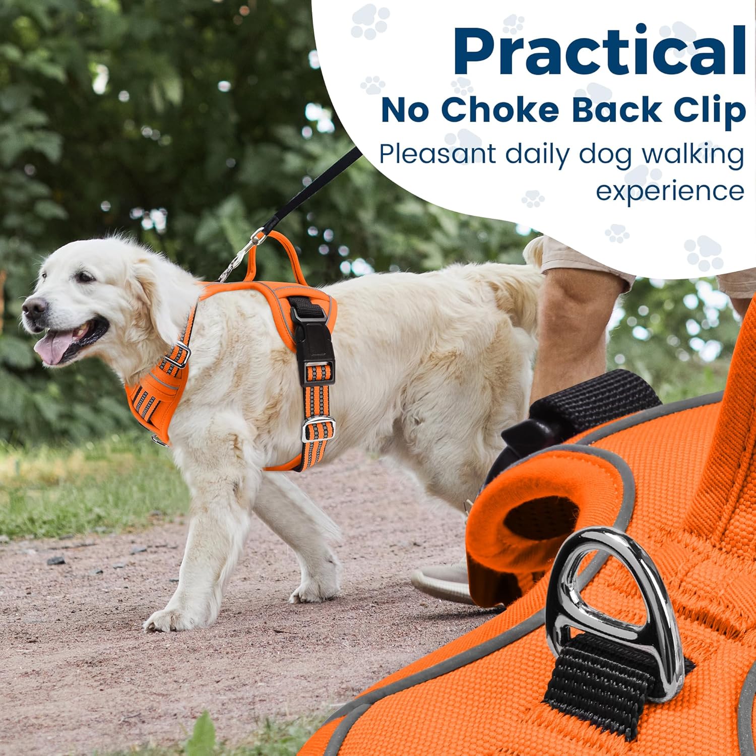 Funfox Dog Harness No Pull, Adjustable Pet Vest Harness, Super Soft Material with Vertical Handle Easy Control, Reflective Night Walking, 2 Leash Clips for Large Dogs, Orange, L