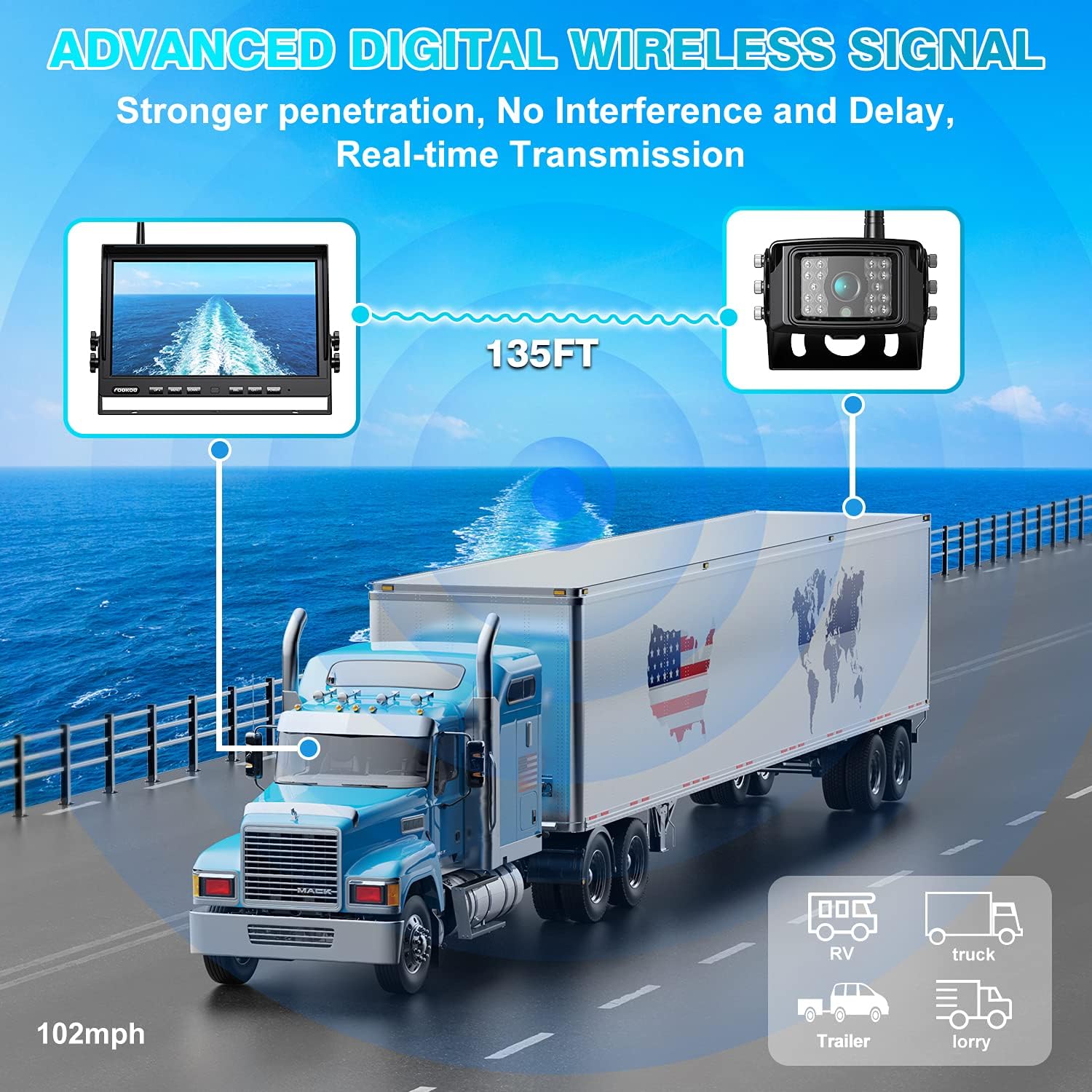 - 【Advanced Digital Wireless Signal】The system with stable digital signal works flawlessly within 128ft range in open area, enough for any large vehicles. Even at the high speed of 102 mph, the monitor will display the surroundings in real time, making your driving more convenient. There is no interference, flicker, blurring or delay.