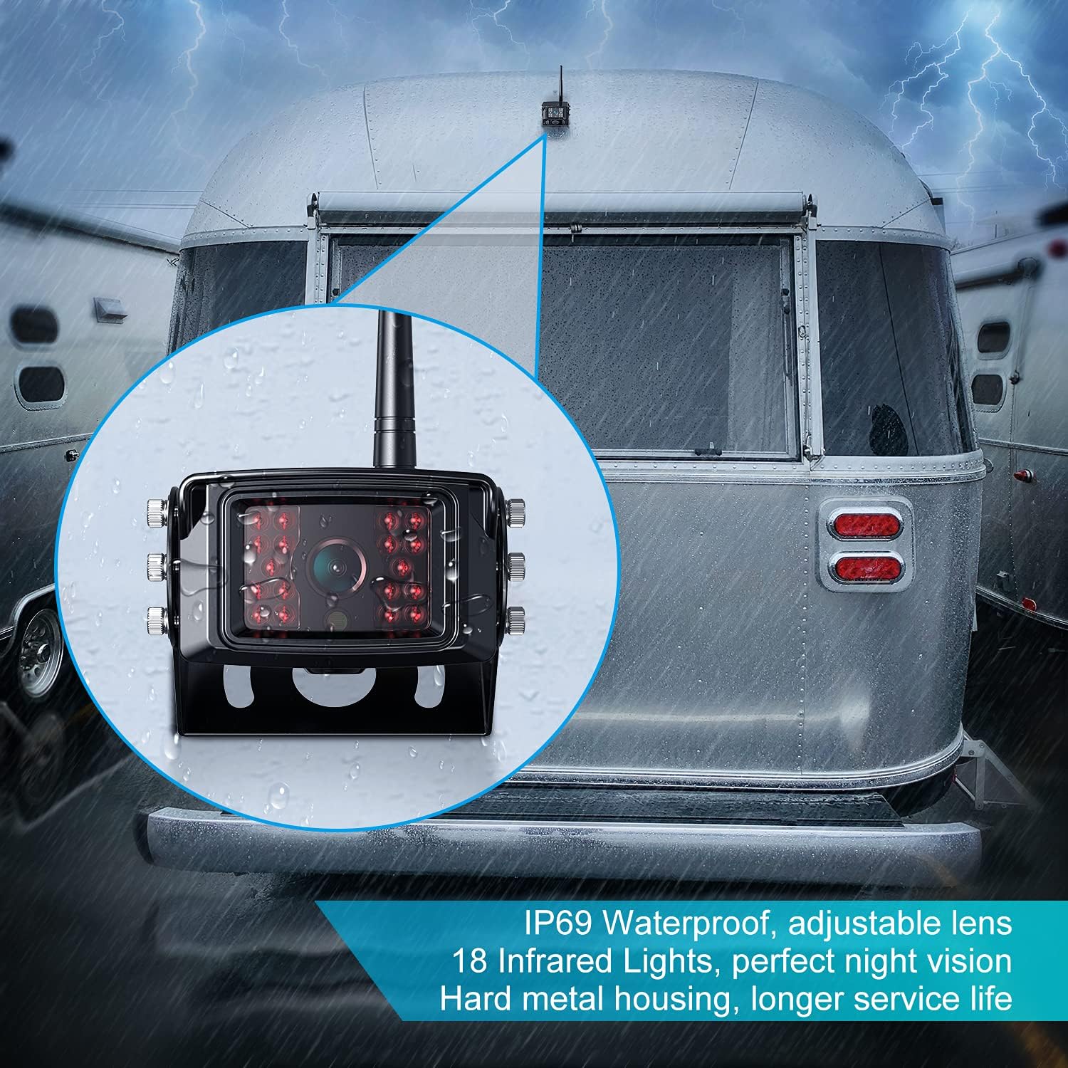 - 【IP69 Waterproof Camera】The IP69 waterproof camera works perfectly in any extreme weather. With 18 infrared lights, the camera can provide HD night vision for you. The lens of the camera can be adjusted up and down, allowing you to view from different angles. The hard metal housing makes the camera serve longer for you.(It can work with Furrion pre-wired RV, please ask us for the bracket adapter.)