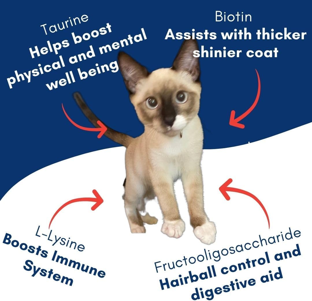 - NUTRITION MEETS FUNCTION: We not only show all of our ingredients, but we display how much as well! Our cat snacks are grain free, contain no added sodium, artificial additives, fillers, flavors, or colors. We believe in full ingredient transparency! We set out to create cat squeeze up treats that contain Biotin for coat shine, L-Lysine for a better immune system, FOS for gut & digestive health to prevent hairballs, & Taurine for physical/mental well being!