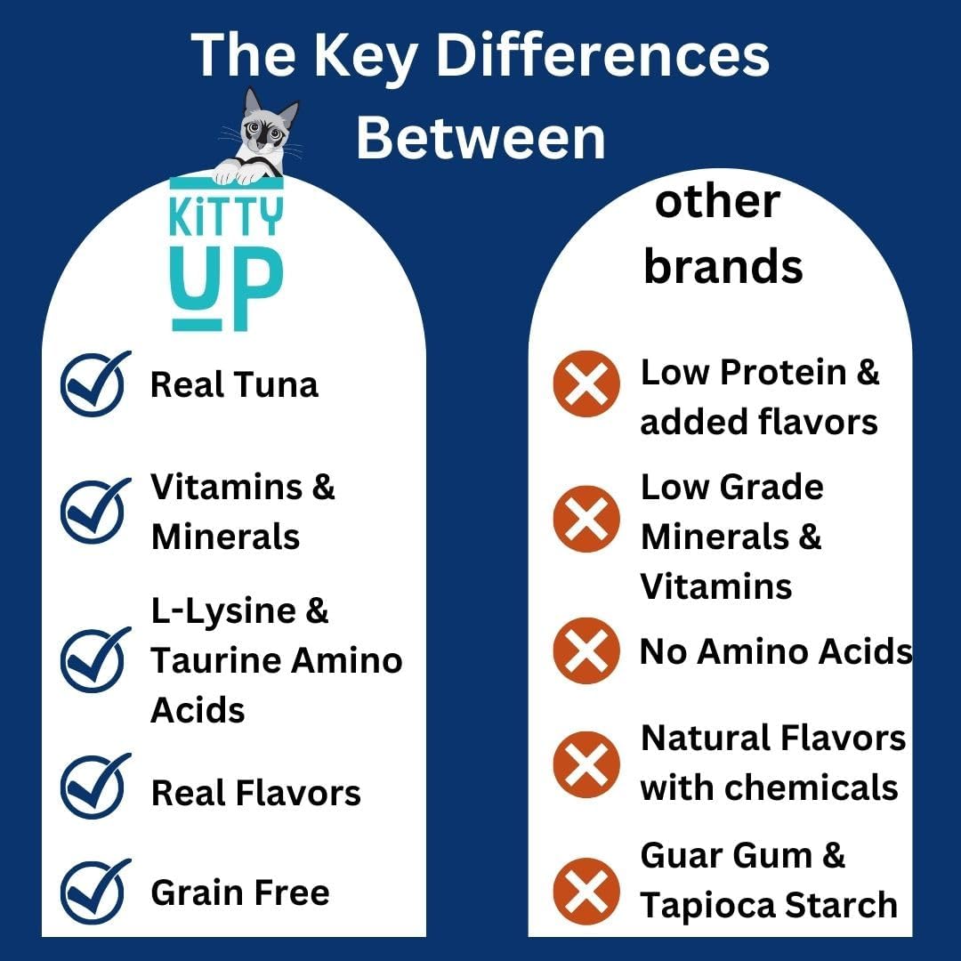 - EASY, TESTED, & SAFE: The ingredients were carefully selected to create an essential cat puree that has undergone stringent quality inspection and hours of development with leading animal nutritionists! Kitty Up soft cat treats are crafted to the highest standards! With your cat in mind, we believe we are building better food for our pets to live happier lives.