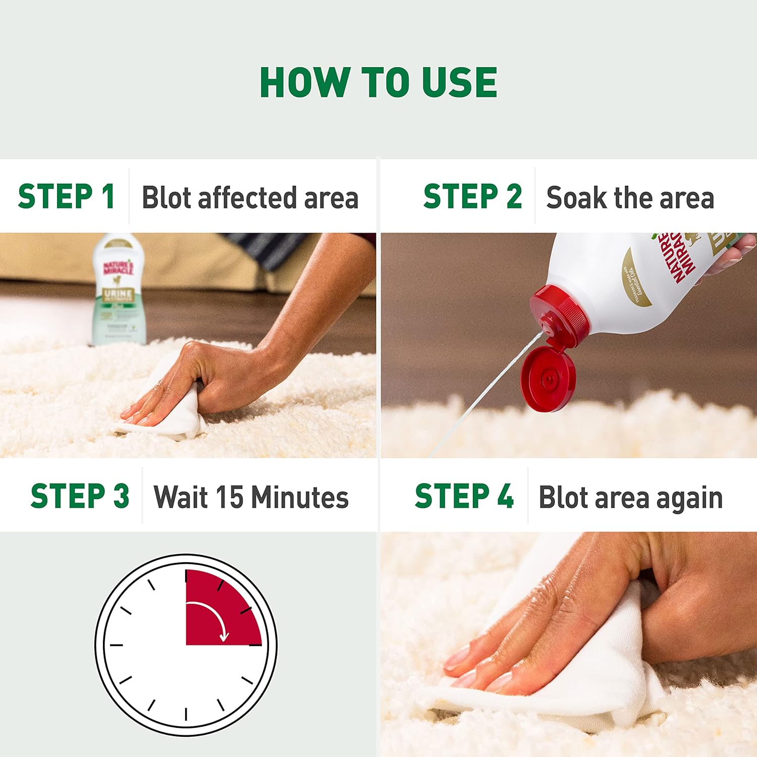 - POURABLE FORMULA: Just soak the affected area, allow to work for 15 minutes, then blot up stain with a clean cloth.