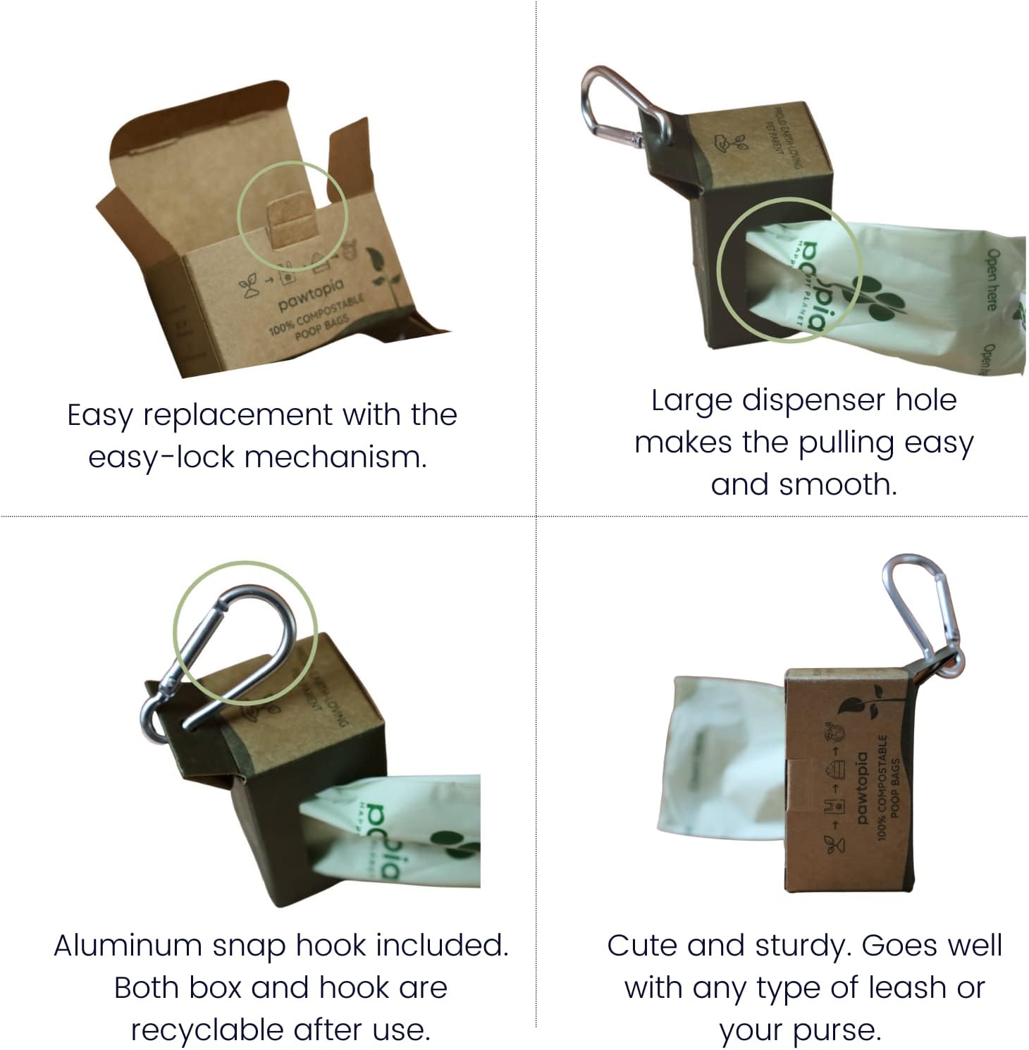 - Paper dispenser for your quick access: You are busy and cannot locate your dispenser or simply don't have time to replace it with a new roll. Don't worry. With our recyclable dog poop bag holder, all you need to do grab and go. Note: This paper dispenser is for short-term use only (for one or two rolls depending on the usage). Once you are done, please toss it into a recycle bin. Our kraft paper dispenser and aluminum snap hook are all recyclable.