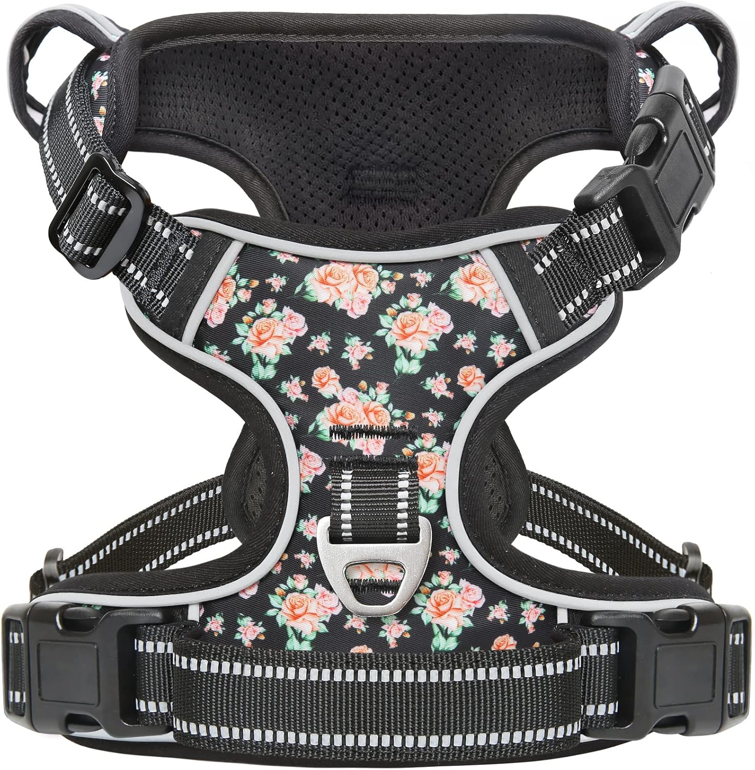 - 【MUCH SAFER & MORE COMFORTABLE】 Breathable mesh lining with soft sponge padding plate of puppy harness prevents injuries, giving extra comfort and protection with enhanced 1600D oxford fabric. The reflective material will be really nice when it gets dark. Also, your dog will be saw easily. This reflective material can make drivers have long time to react, which ensure your dog’s safety!
