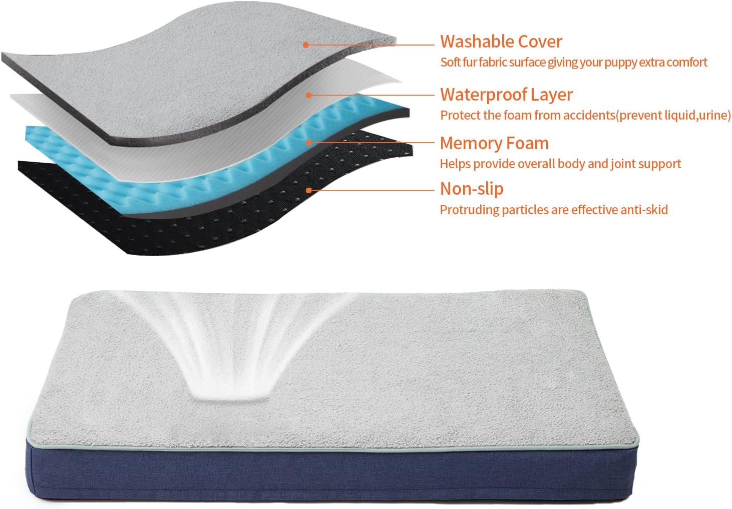 - 2 Layer of Covers: The cooling dog bed with washable short plush cover. Middle layer waterproof fabric prevent urine penetration and keep the foam clean and prolong the service life of the memory foam dog bed.