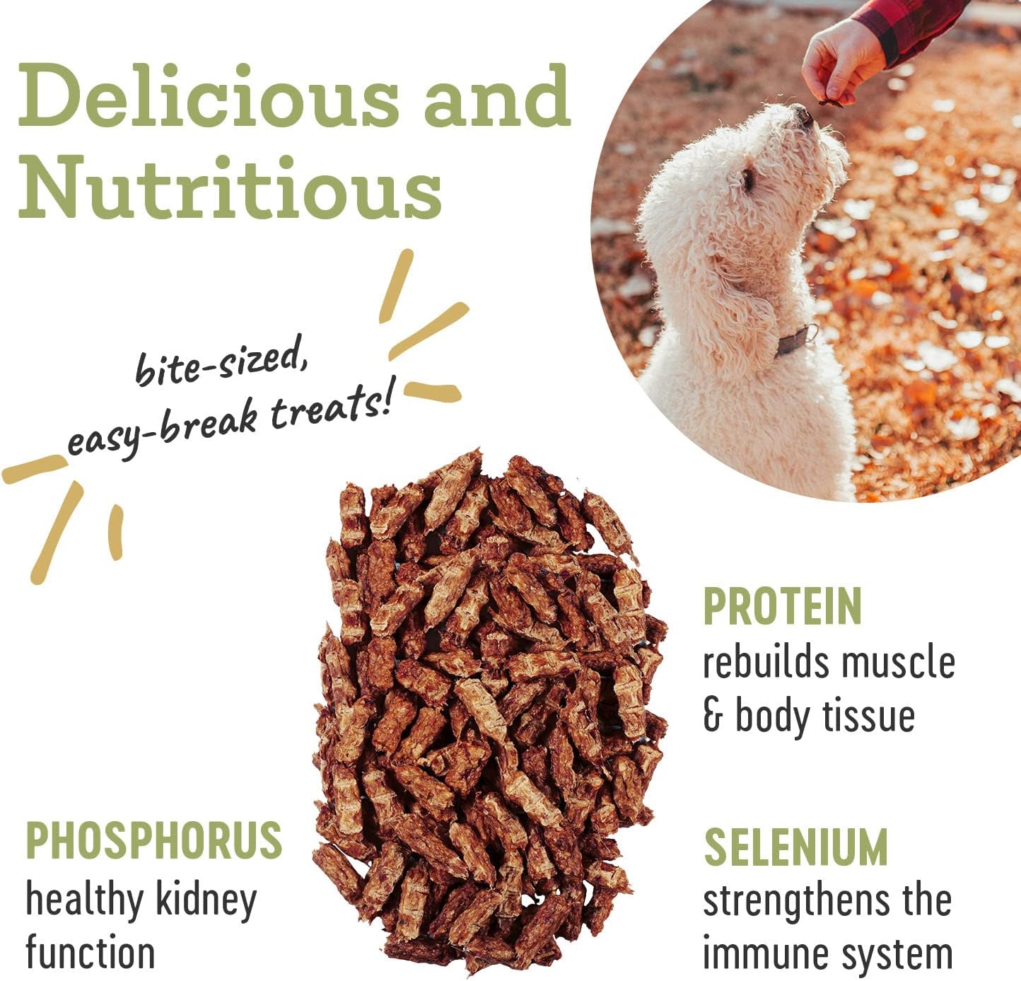- HEALTH & NUTRITION - Our Duck Trainers jerky treats are full of vitamins and minerals. Selenium helps strengthen the immune system, leading to healthy skin and a shiny coat. Phosphorus helps support healthy kidney function. And healthy levels of protein to help build and repair your dog's muscles and body tissue.