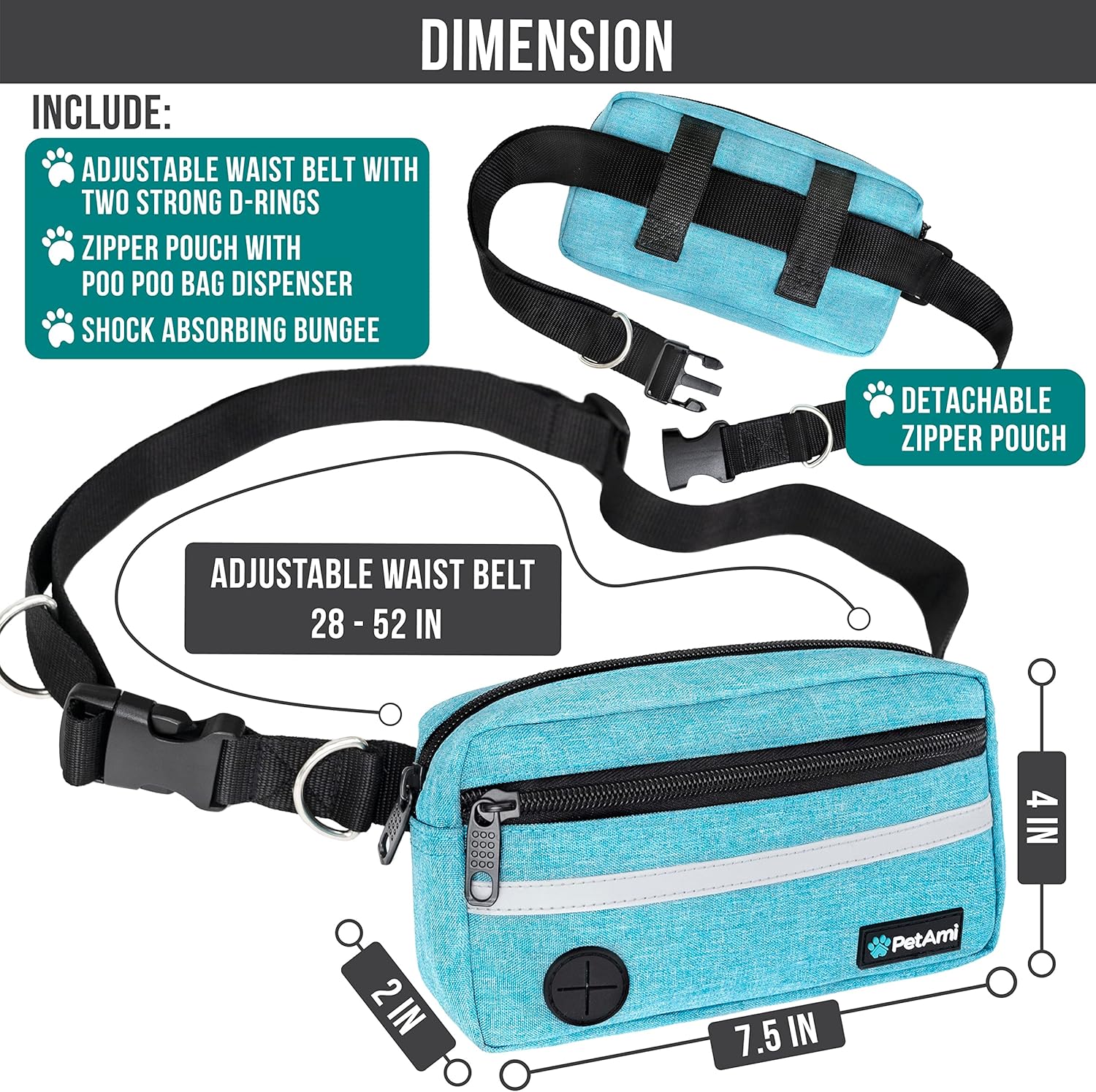 - AROUND THE WAIST DOG LEASH FOR RUNNING: PetAmi Dog walking fanny pack reinforced an extra padded bungee cord leash handles for superior grip and control while you are jogging, walking or training dogs. Our wearable hip dog walking bag also features a safety reflective trim on its front ensuring both you and your dog are easily visible to others, enhancing safety and visibility. Enjoy the perfect blend of security and comfort with PetAmi waist belt bag with dog leash for large dogs.
