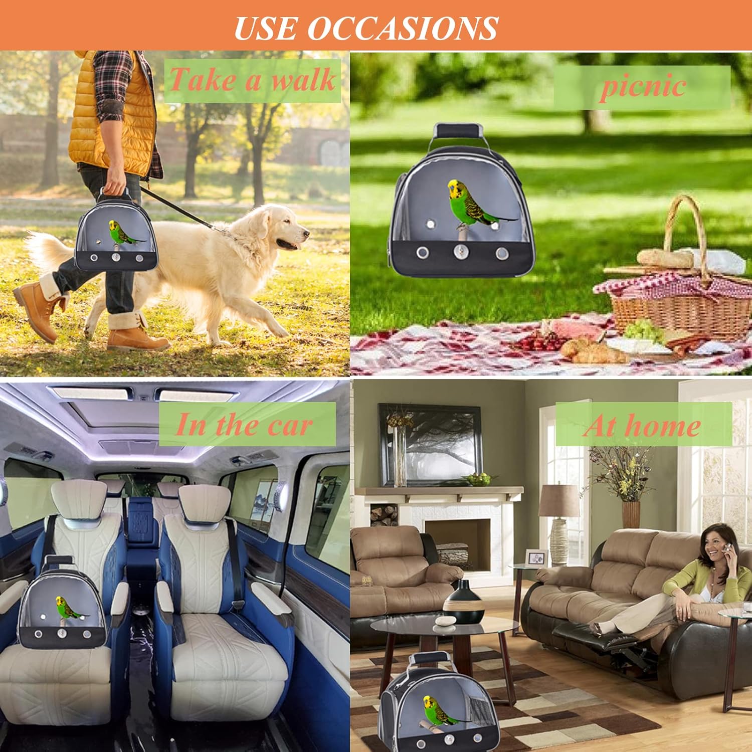 - 1.Big Transparent Window: There is a large transparent window made of PVC in the front of the bird carrier bag. This clear window allows small pets to see the scenery outside during their travels, and you can keep an eye on your pets at all times