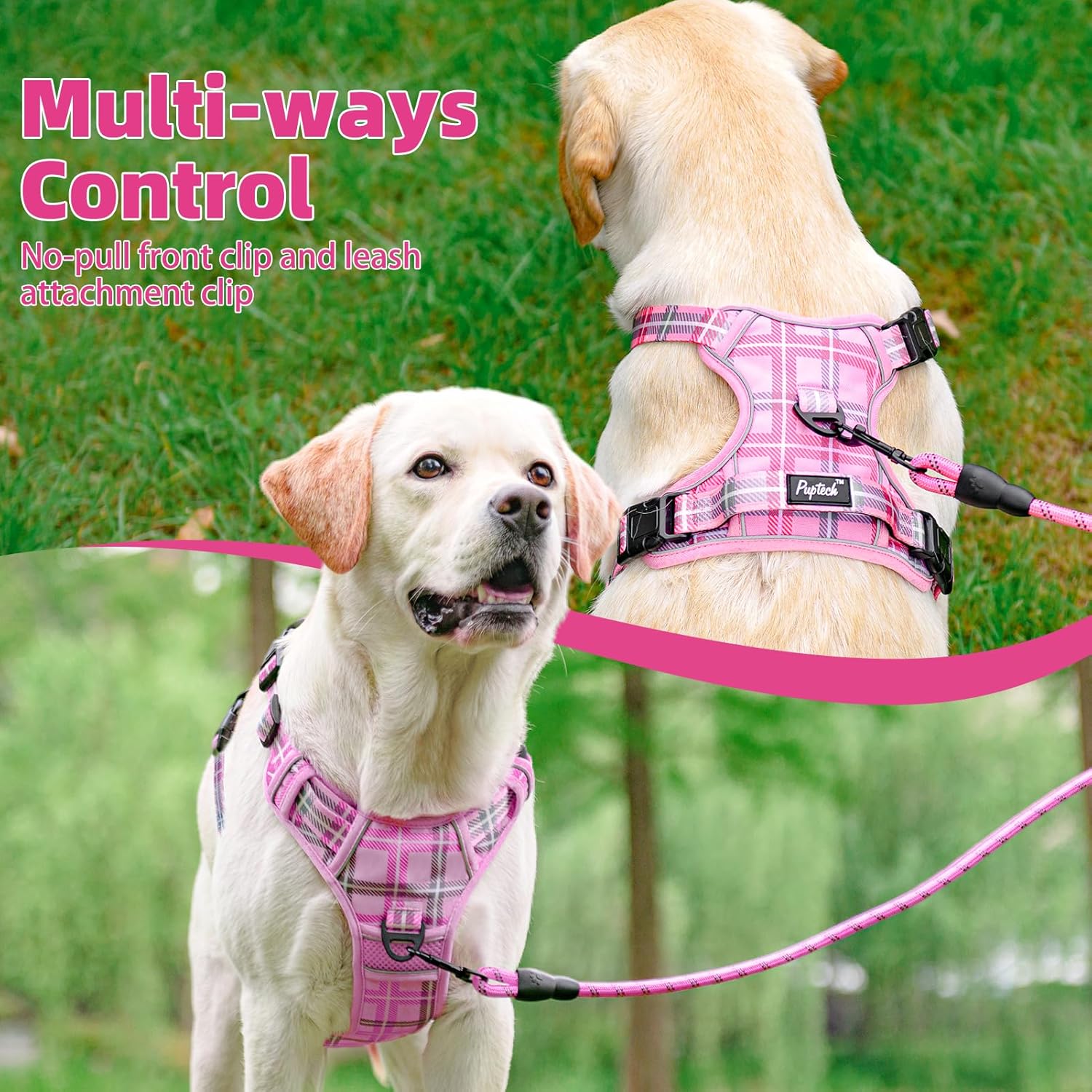PUPTECK No Pull Dog Harness for Large, Adjustable Reflective Dog Harness with Handle Easy Control, Comfortable Soft Padded Pet Vest Harness for Large Dogs, Plaid Pink L