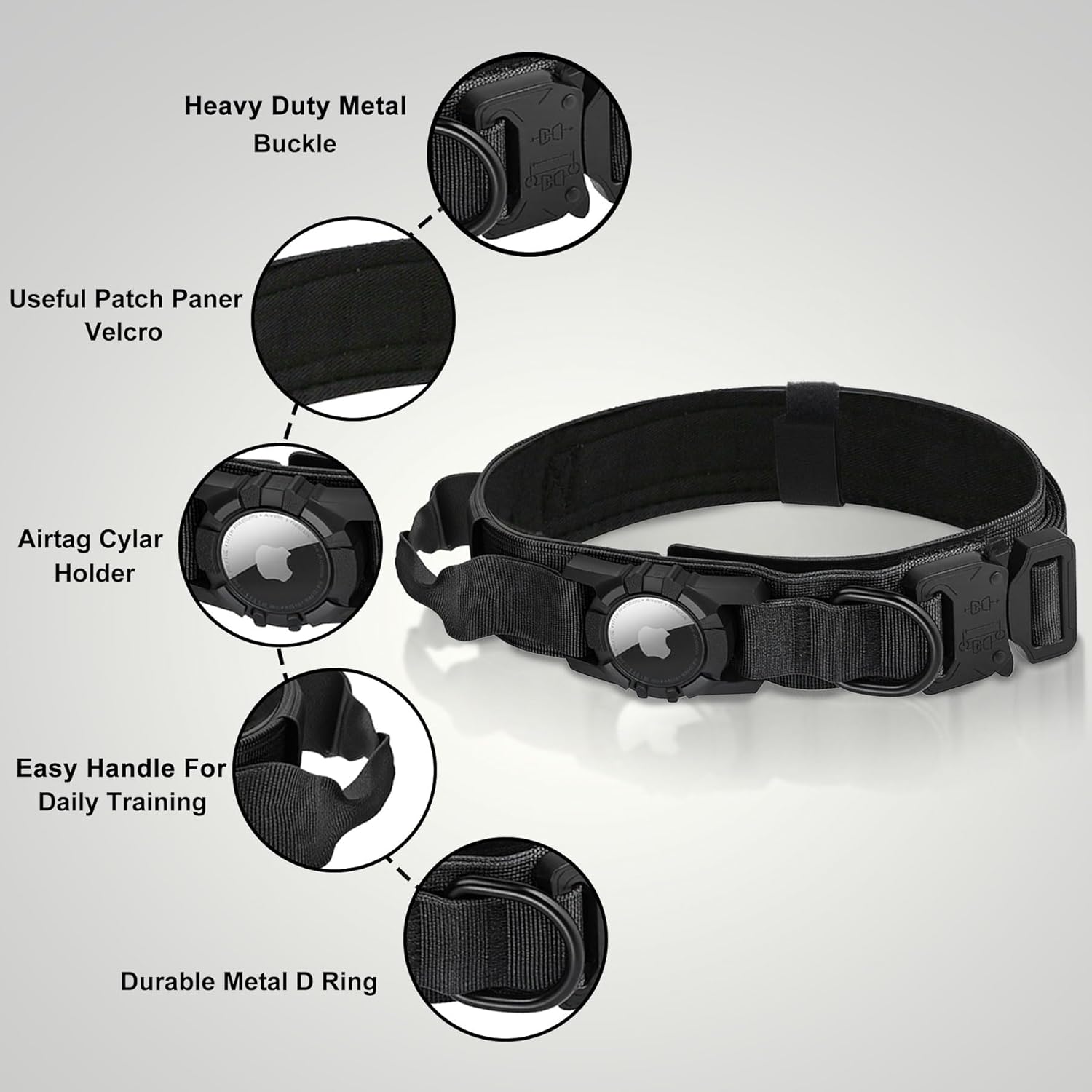 Tactical AirTag Dog Collar - Heavy Duty, Adjustable GPS Collar Compatible with Apple AirTag, with Holder & Control Handle for Medium/Large Dogs [ Black, XL ]