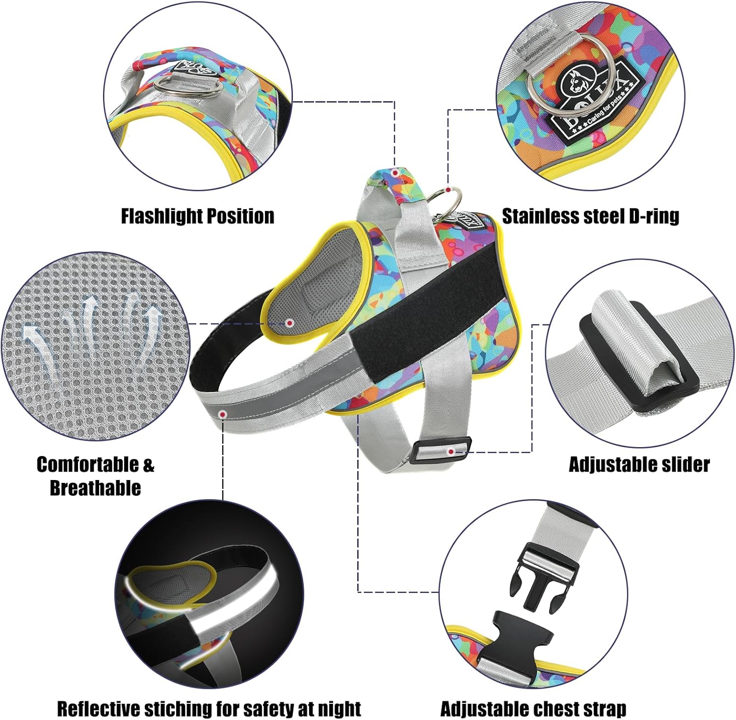 - OUTDOOR HEALTHY: Puppy no pull dog harness with reflective straps to ensure your dog is highly visible and keep dogs safe at night. You can connect the dog leash on the D-ring and with handle is easy to control on crowded streets. The high-end pet harness is perfect for daily walking, running, hiking, training, hunting, outdoor adventure and more!