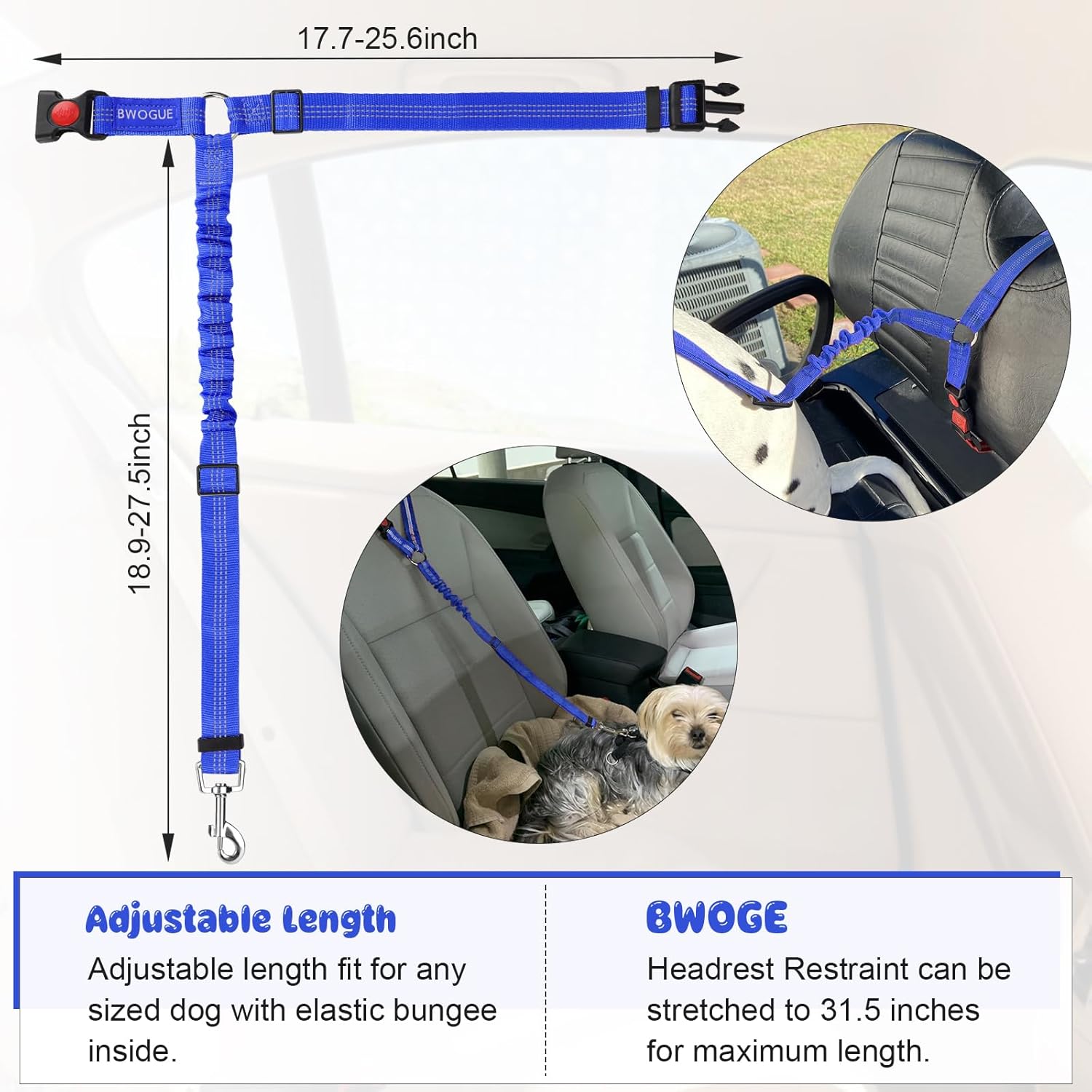 - ADJUSTABLE LENGTH: Dogs come in different sizes and weights. With buckle on the straps and the elastic bungee inside, The BWOGE Headrest Restraint is adjustable between 18.9-27.5 inches and can be stretched to 31.5 inches for the maximum length. The circle can be adjusted from 17.7 inches to 25.6 inches.You can easy to adjust the dog leash to the suitable length to keep your pet in a safety state.