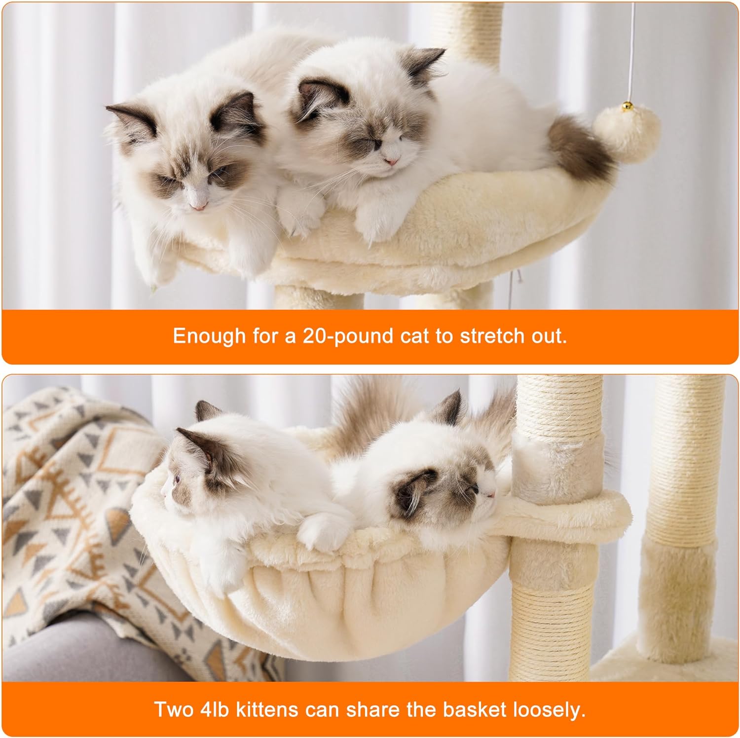 - [68" Tall, Multifunctional Design] Step-like jump multi-layer structure design of cat furniture, convenient for cat's scratching, climbing, sleeping, and exercising; The big cave, basket and hammock offer private space for catnap or hiding; Hammock to lounge and enjoy the leisure time