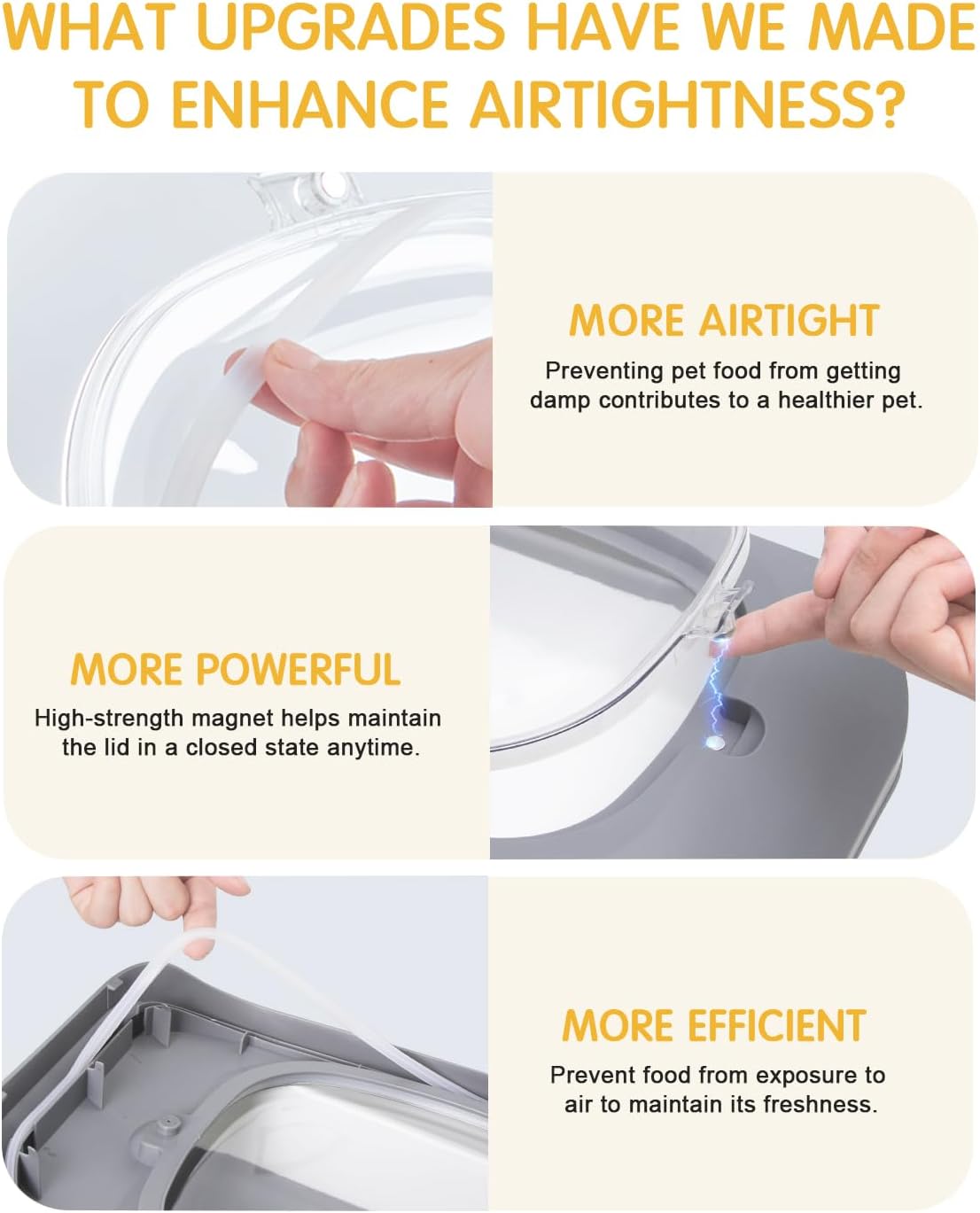 - MOISTURE-PROOF: Airtight dog food storage container, the bottom slightly elevated design allows the dry food away from wet ground to ensure that the pet fresh food is available.(Tips:when you close the small dog food containers' transparent lid, please make sure it is completely closed with no space)