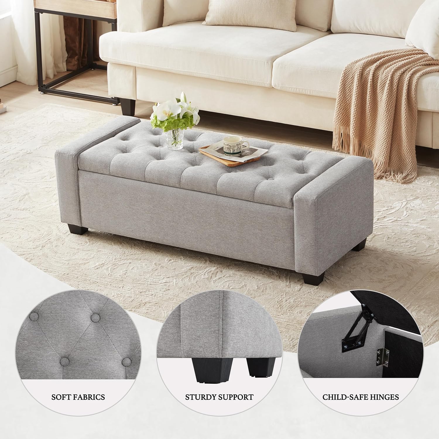 - Enhanced Safety with Dual Hinges: Our storage bench for bedroom is equipped with dual safety hinges; Allowing the lid to open wider and more smoothly. Enjoy quiet operation and protection against finger pinching