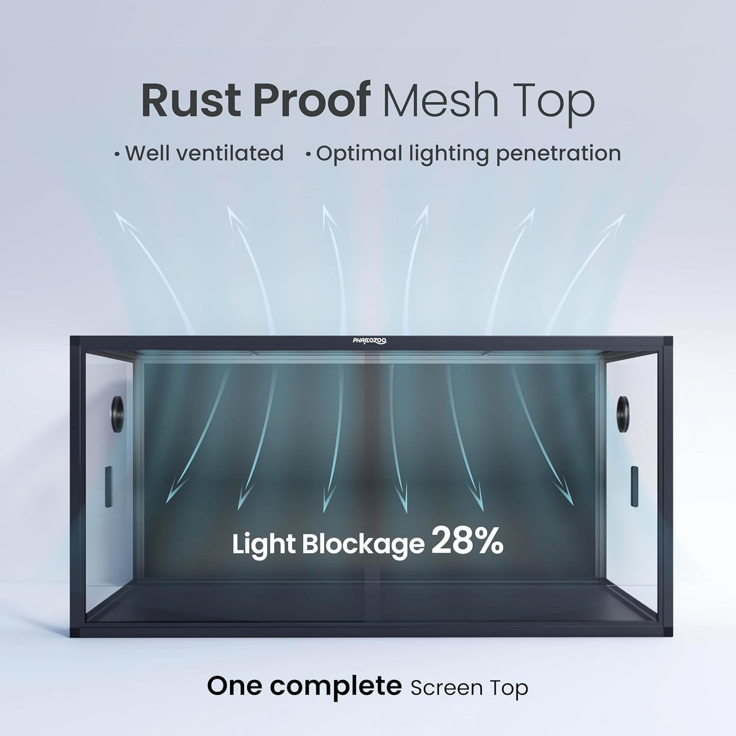 - ăWorry LessăNO GAPS FOR ESCAPING with fully closed structure. Rigid tempered glass doors with tiny door gaps. Rust proof top screen ventilation allows better air circulation and optimal lighting penetration.