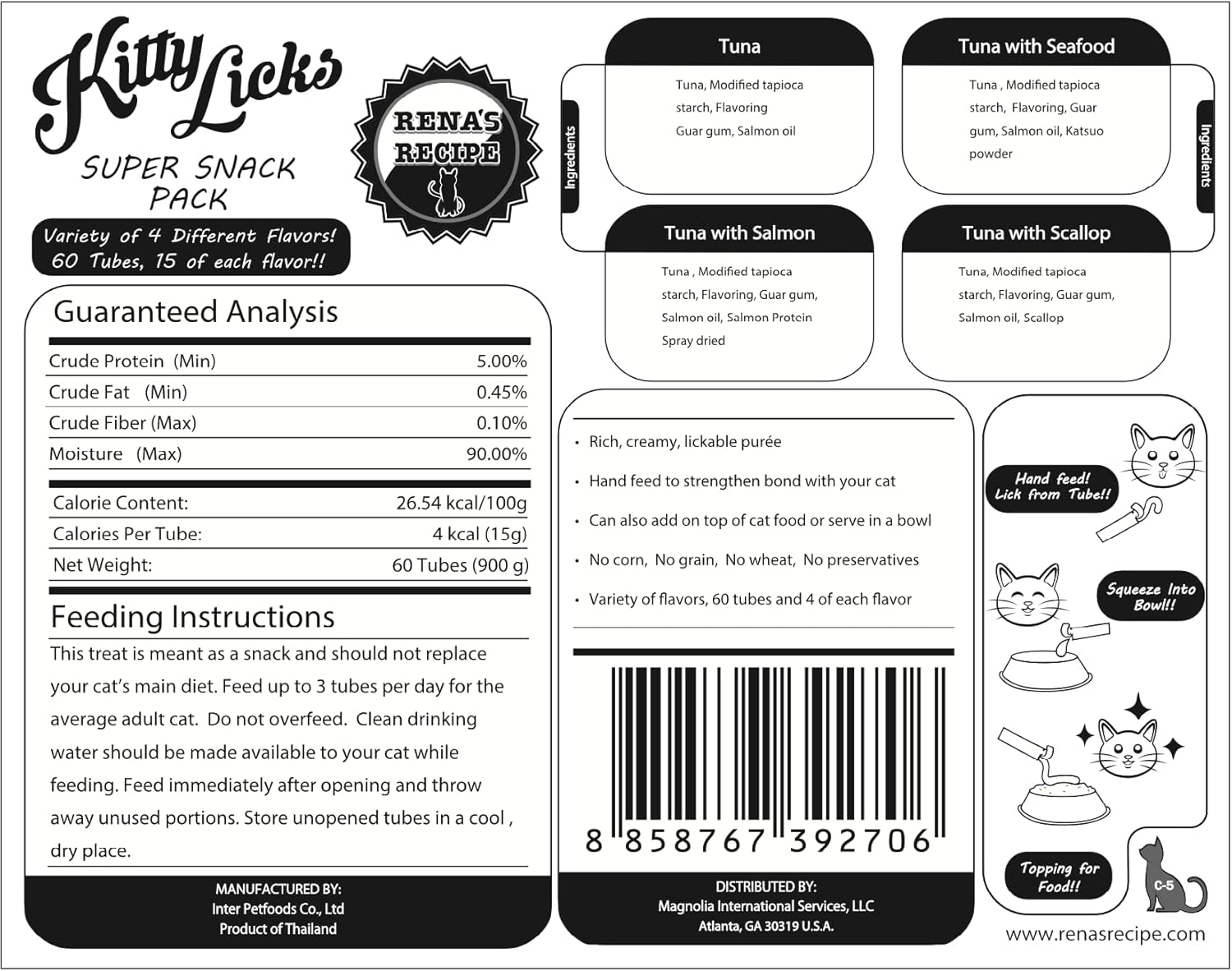 Rena's Recipe Kitty Licks Tuna Barrel (60 Tubes) 4 flavorsX 15 Tubes Cream Lickable Cat Treats 4 Different Flavors: Tuna with Seafood, Scallop, and Salmon