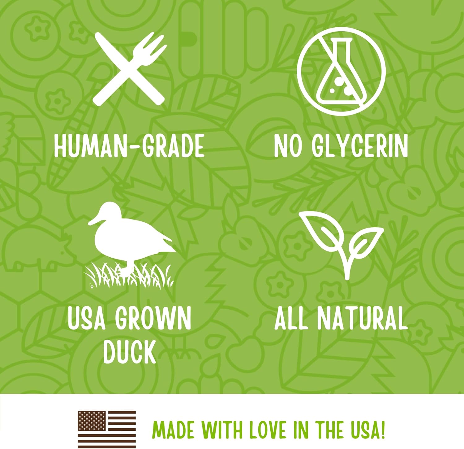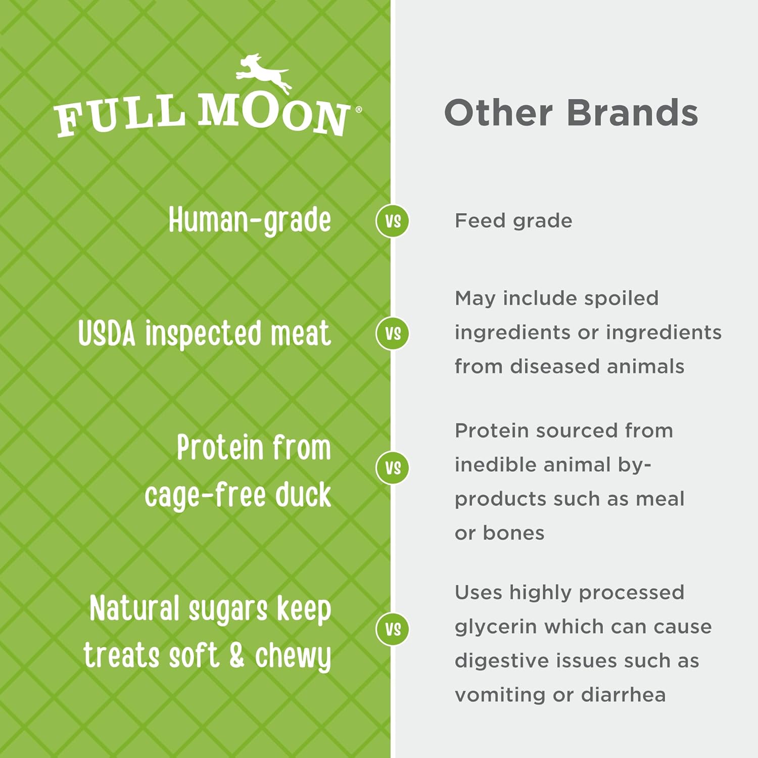 - U.S.-GROWN DUCK: Full Moon treats are proudly made in the United States using regionally sourced ingredients, including USDA approved, cage-free duck.
