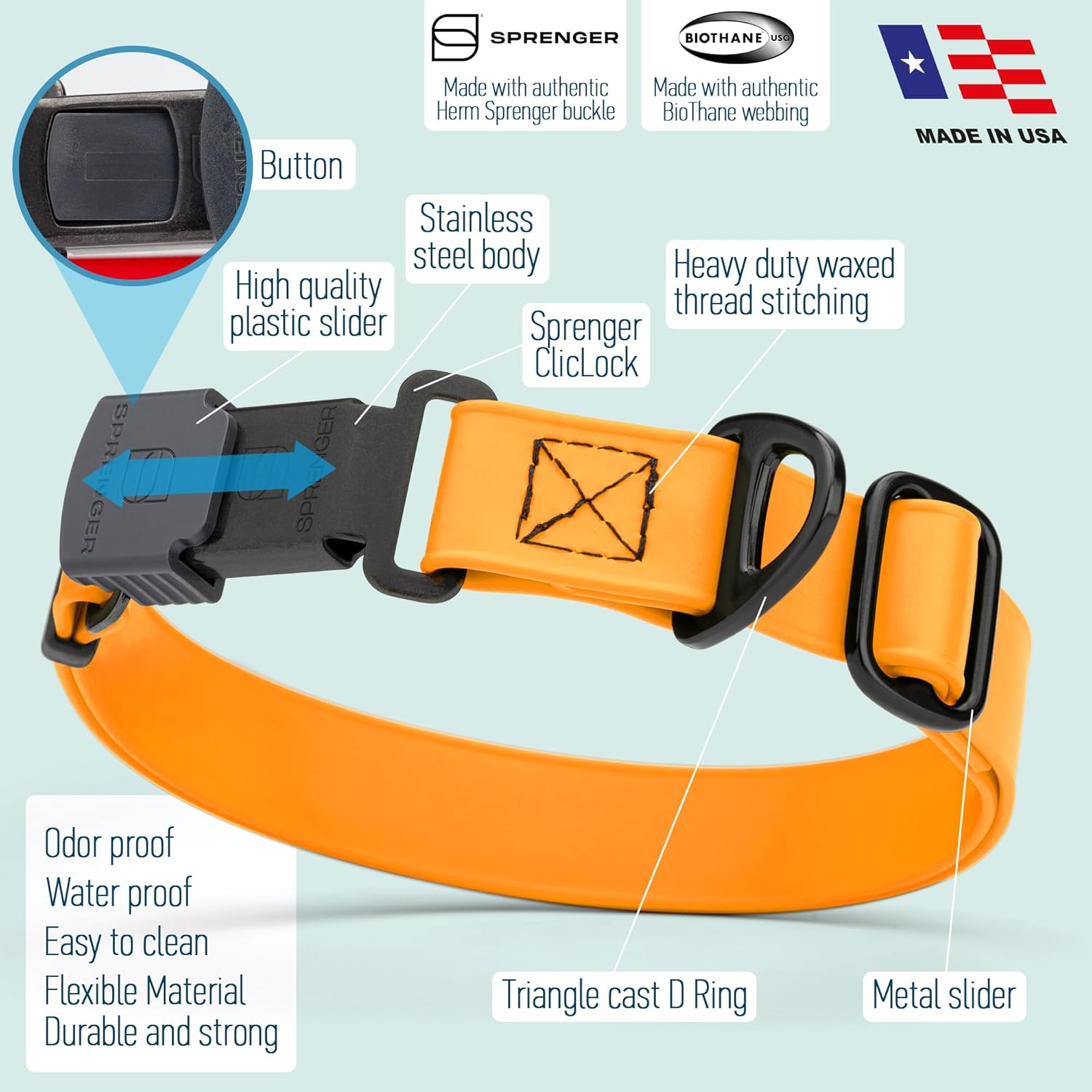 Dogline Biothane Waterproof Dog Collar with Herm Sprenger Black Stainless Steel Quick Release Buckle – Heavy Duty Tactical Durable Collar for Dogs – Comfortable, Safe Pet Collar W 1" L15-25 Tangerine