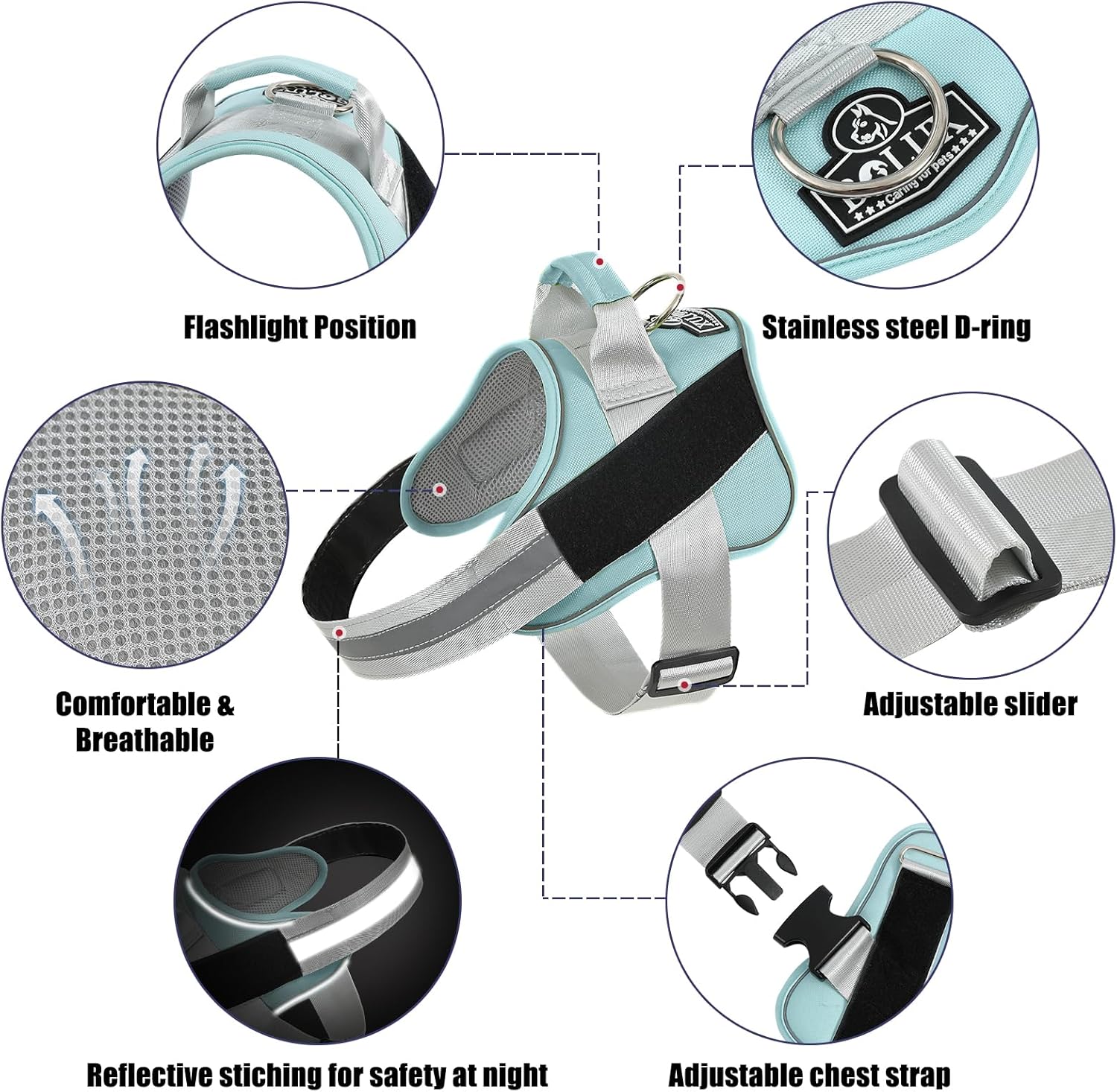 - SUPER COMFORTABLE: Bolux no choke dog harness pulling pressure is evenly distributed to the body to prevent pulling and choking. The dog vest harness have a adjustable chest strap with snap on buckle, move its body parts freely, can customized fits for your puppy growth do not need to always change it.