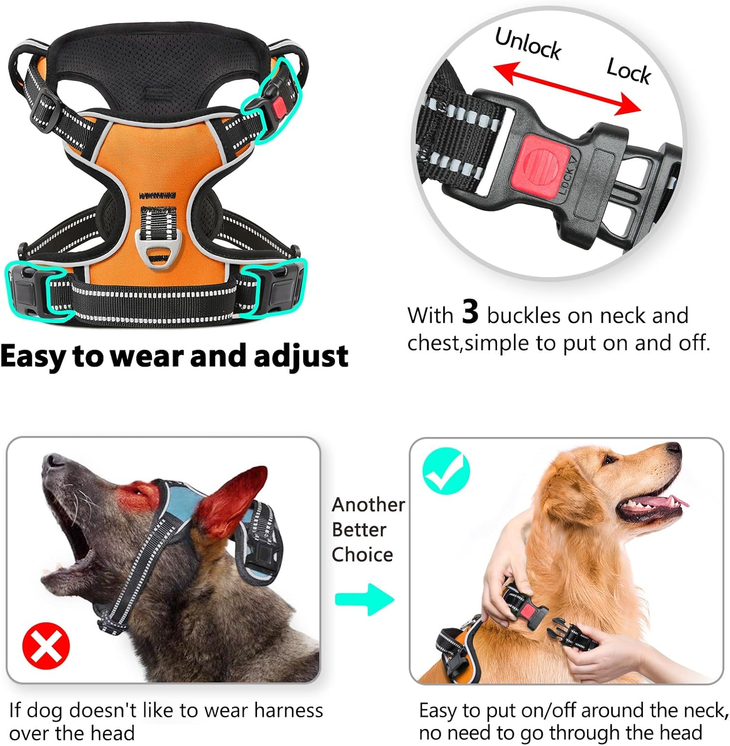 - 【3 FAST RELEASE BUCKLE】This dog harness has 3 snap buckles is easy to put on and take off .( One is on the neck(Lockable Snap), two are on the chest), NO NEED go over dog’s head. This will let your dog loves to wear harness! Attention: Size XL: Neck 58-89cm/23-35in, Chest 53-97cm/21-38in.