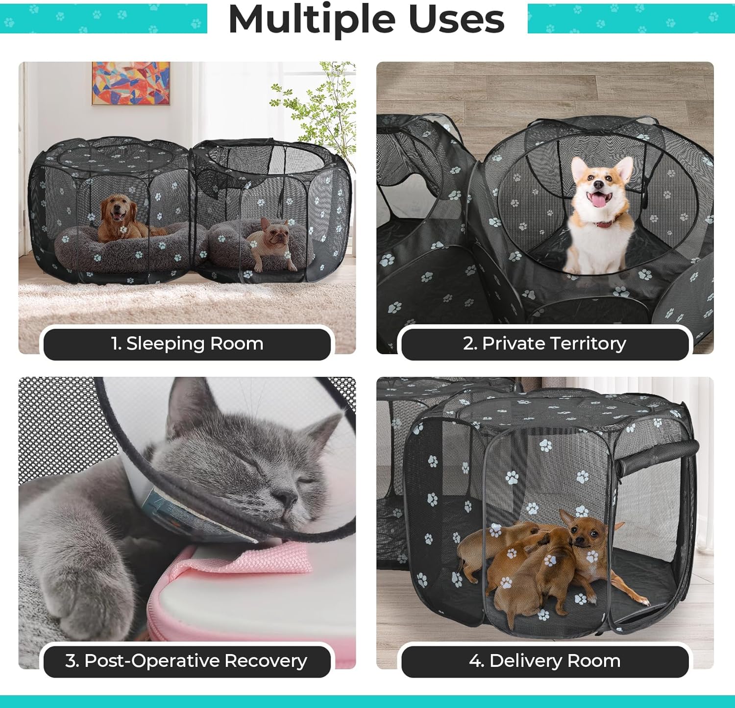 - 【2 in 1 Design with cute paw pattern】This cat playpen is upgrade version with cute paw pattern print. Design with 2 compartments, best for multi-pet households, or new pets to make friends. Double rooms pet playpen is also helpful for their potty training with a cat litter box in the compartment.