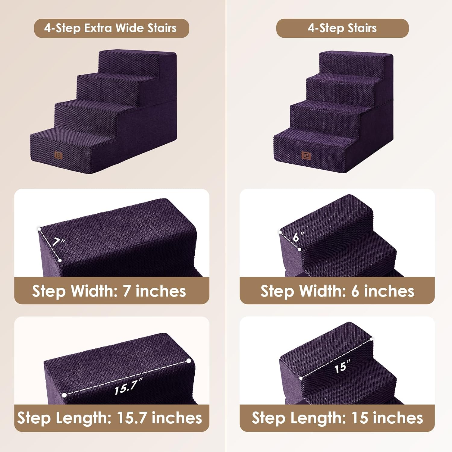 - MULTIPLE STEP SIZES - This dog stair comes in 3, 4, and 5-step options. Our 3-step pet stair is ideal for sofas and low beds (up to 18 inches high), while the 5-step version is better suited for higher beds (up to 27 inches). If your bed is of medium height (up to 23 inches), please select the 4-step one.