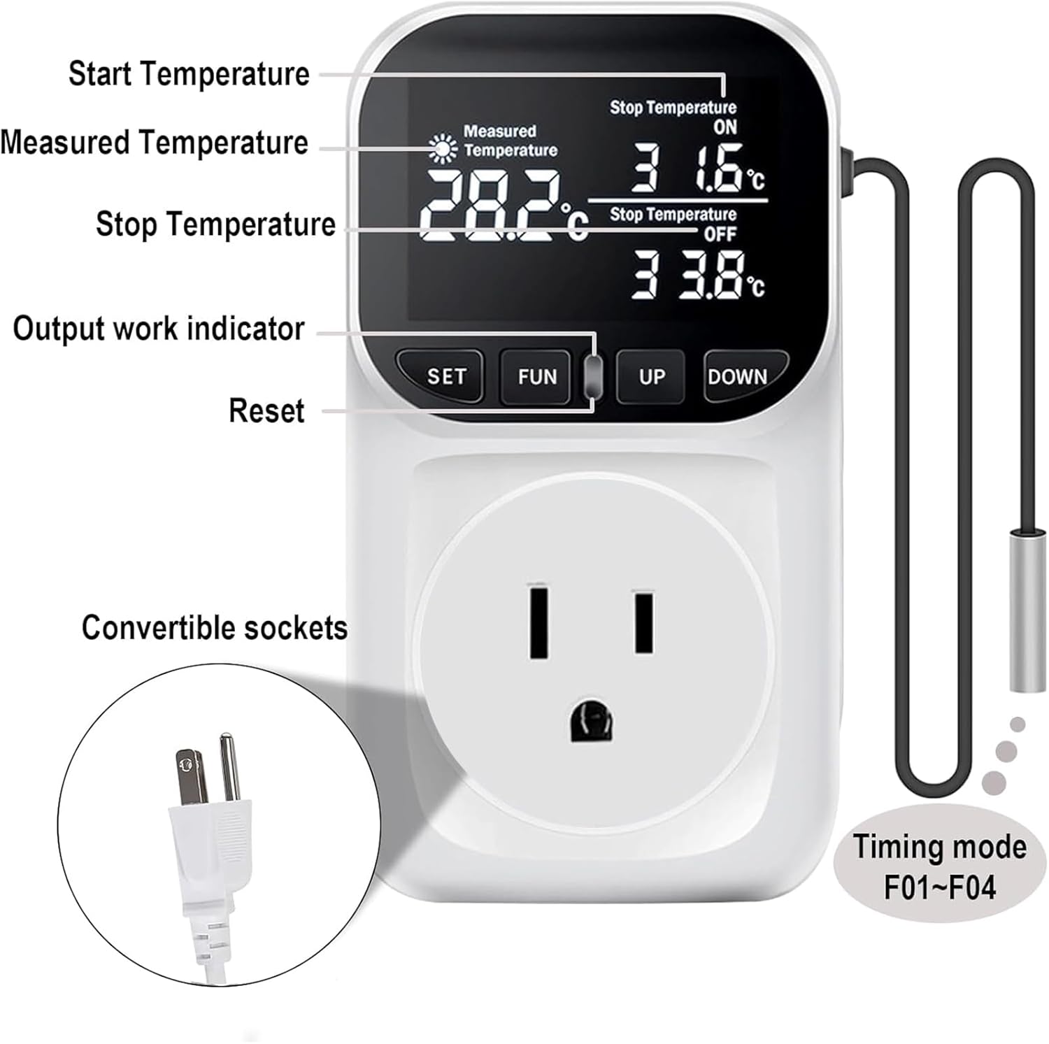 - SPECIFICATIONS: The temperature range is -40β to 120β (-104β~210β), the display accuracy is 0.1β, and the measurement accuracy is +/-1%. The timer accuracy is up to one minute. The digital temperature socket works at 110VAC, the maximum operating current is 15A, and supports a load capacity of up to 1800W.