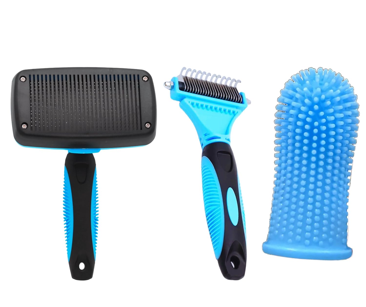 - COMPLETE 3-IN-1 PET GROOMING KIT: This all-in-one pet grooming kit includes a self-cleaning slicker brush for dogs, a durable undercoat rake for dogs, and a finger toothbrush for dental care. It’s perfect for grooming, dematting, and maintaining hygiene for dogs, cats, and small pets at home.