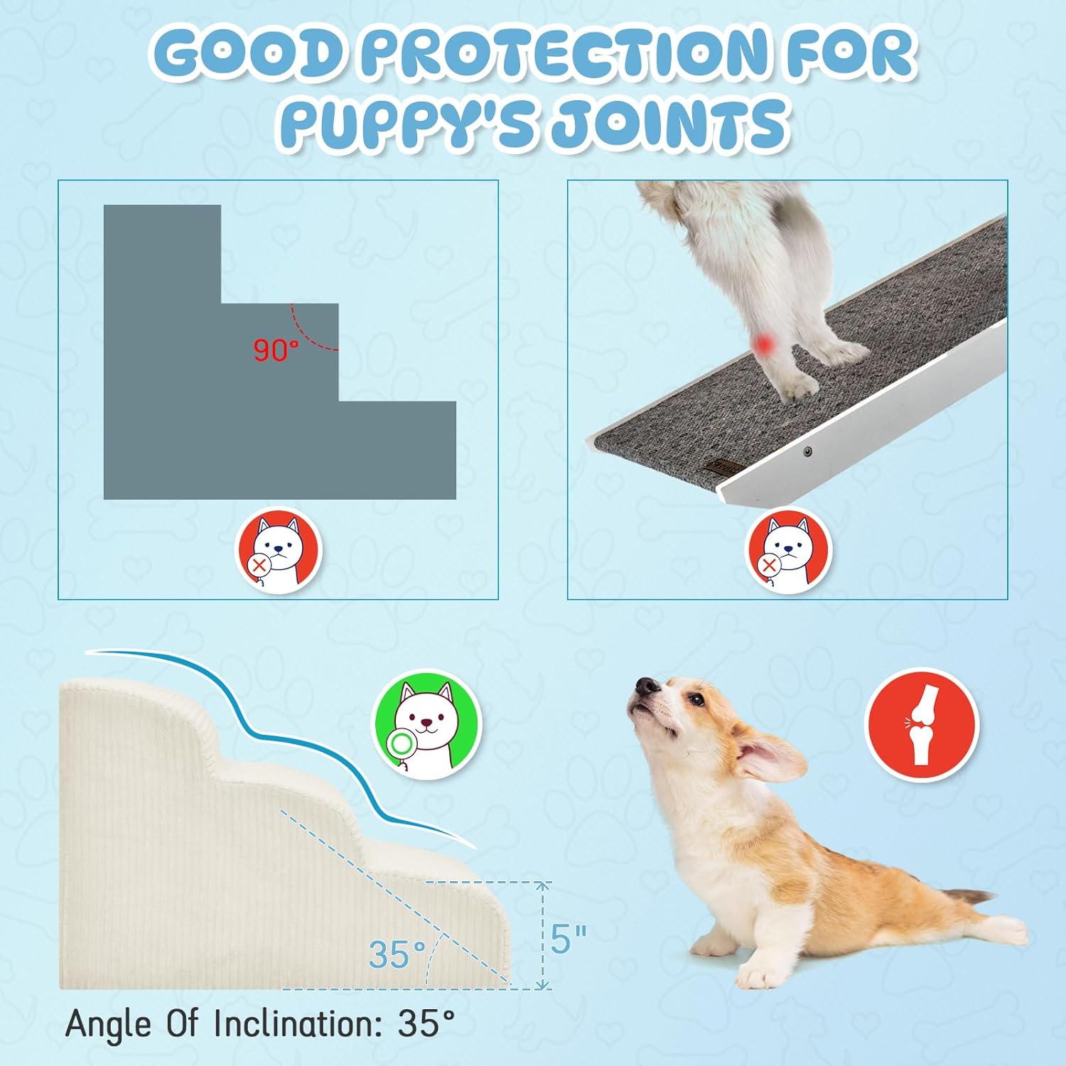 - 【Protect the Dog's Joints & Knees】35° scientific bevels of Mesa Lemon pet stairs can reduce your pet climbing legs' burden, and arc surface design is more friendly to pets with reduced mobility, protecting your dog's joints and lumbar vertebrae fully.