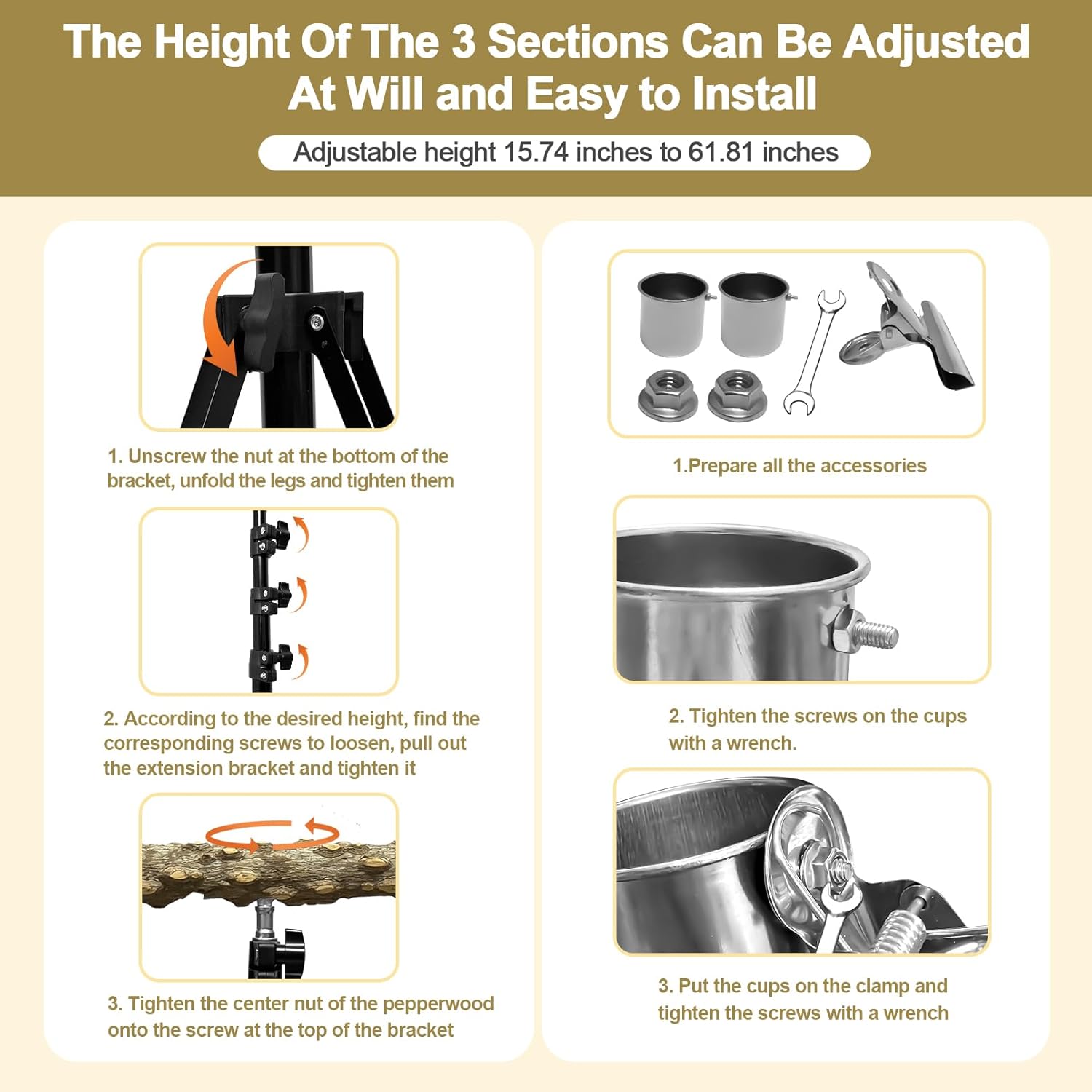 - Height Adjustable: The height of bird perch stand can be adjusted arbitrarily from 16 inches to 63 inches, freeing your bird from the inside of the cage and giving you the opportunity to have a more zero distance interaction with your feathered friends