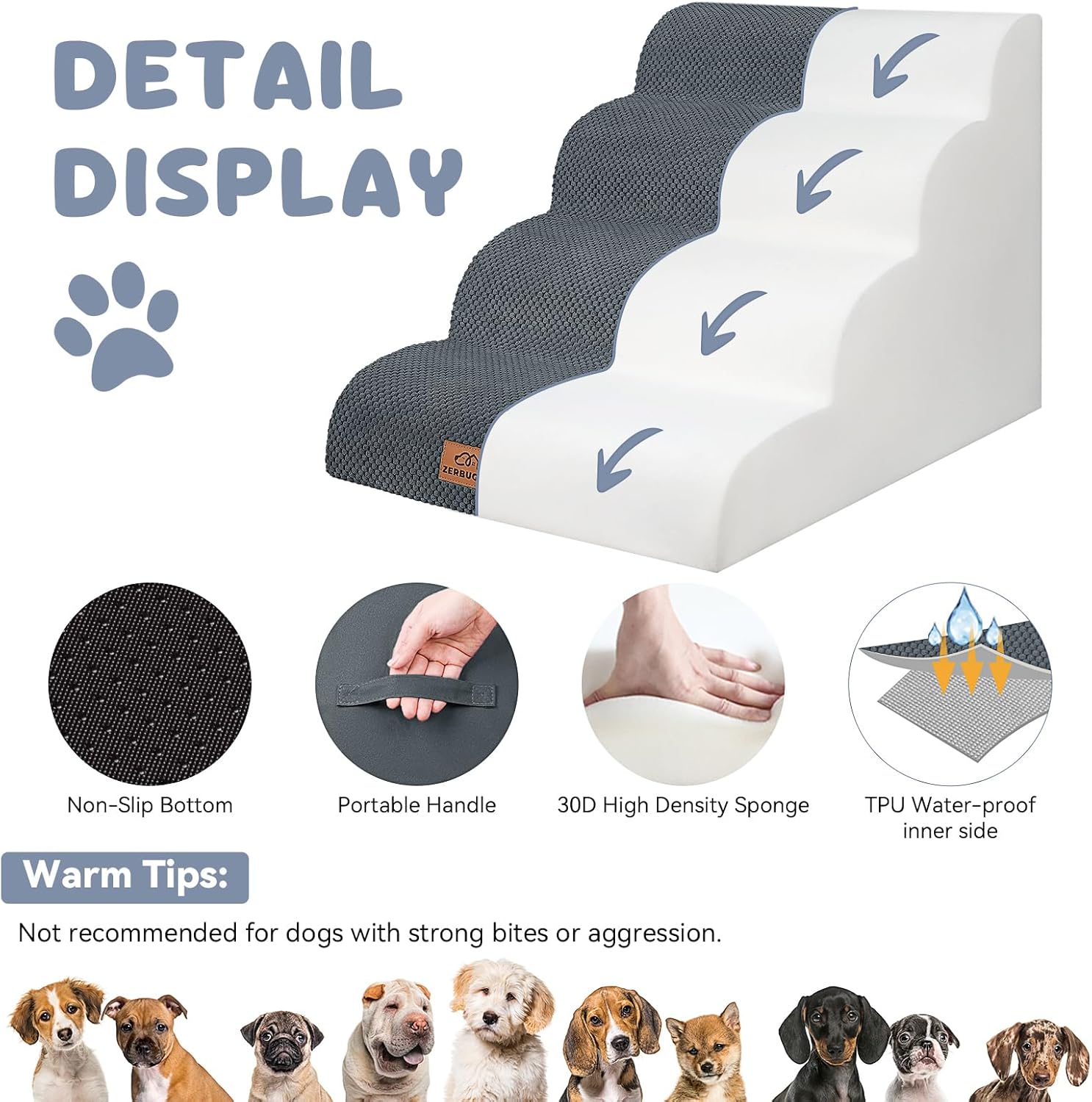- Multi Sizes Fit Every Need: Zerbuger foam dog stair is not suitable for large dogs, please use it for pets under 50lbs! 3-steps are suitable for chairs and couches up to 20inch, 4-steps are suitable for high sofas, beds and window up to 25inch. Please confirm whether the size is suitable for your love pet first.