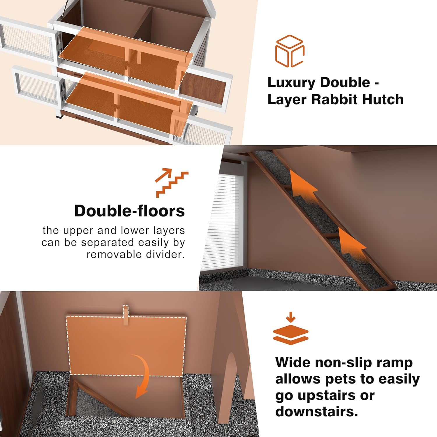 2 Story Rabbit Hutch, Indoor Outdoor Bunny Hutch Solid Wood Rabbit Cage with Removable Trays, Waterproof Asphalt Roofs and Ventilation Door, Small Animal House for Rabbit Guinea Pig Ferret, Walnut