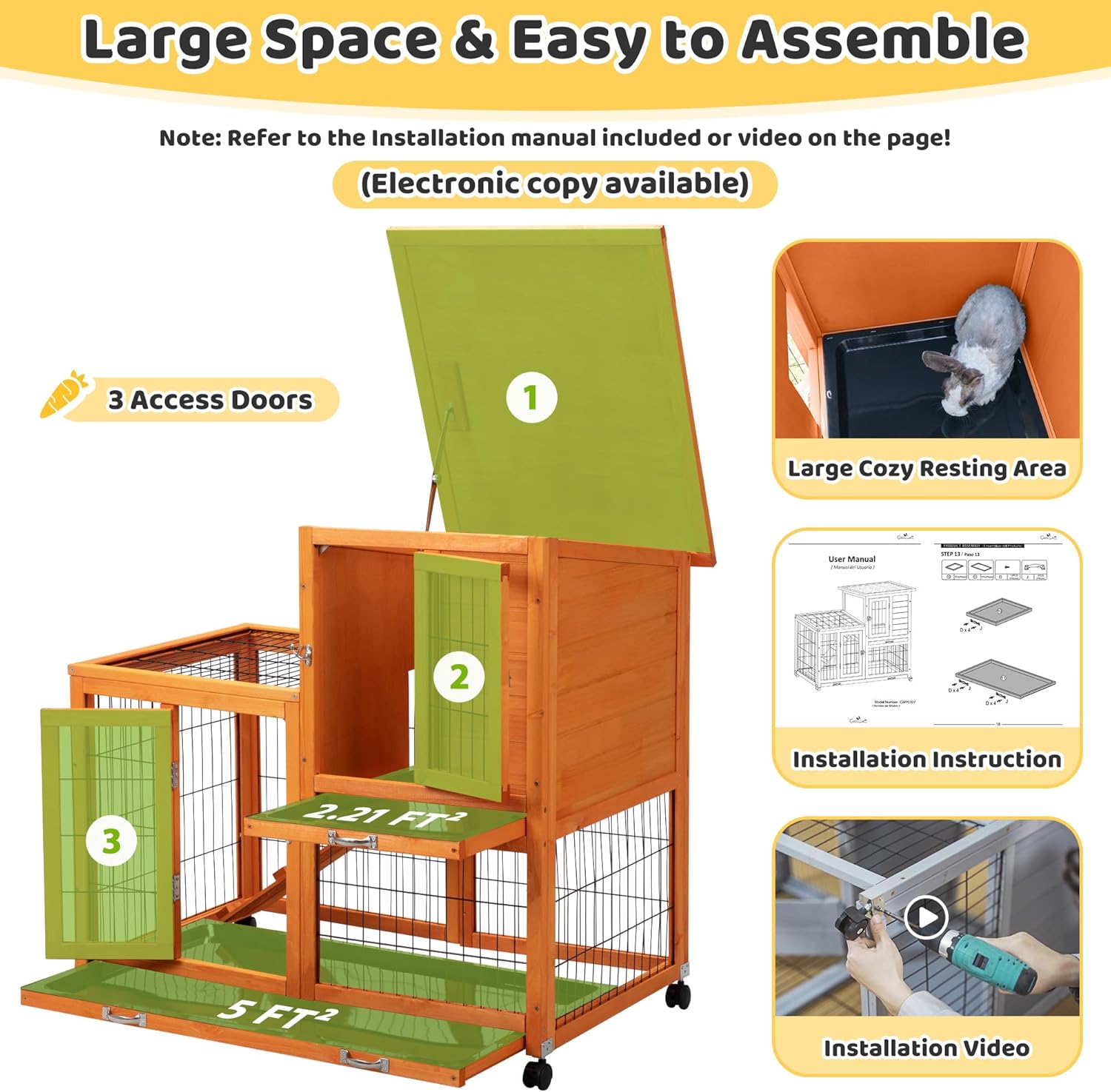 - 【5-Minute Maintenance】Removable 0.79" deep trays with raised edges prevent spills. 3 doors and 1 openable roof allow instant access or replacing pee pads, water, food, or groom your rabbits