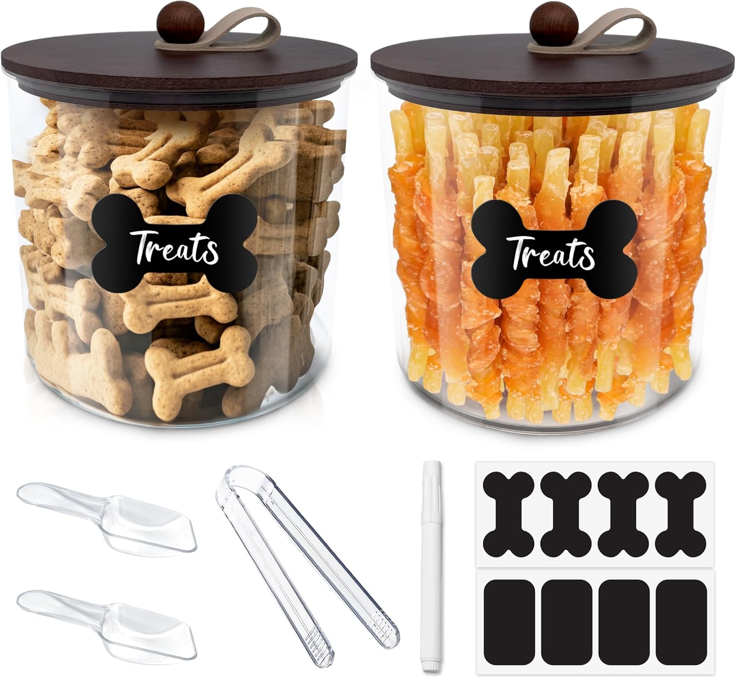 2 Pack Airtight Dog Food Storage Container,Dog Treat Container Dog Treat Jar with Wood Lids 6x5'',Pet Food Storage Container,Cat Food Container with Scoops,Food Tong,Labels,Pen