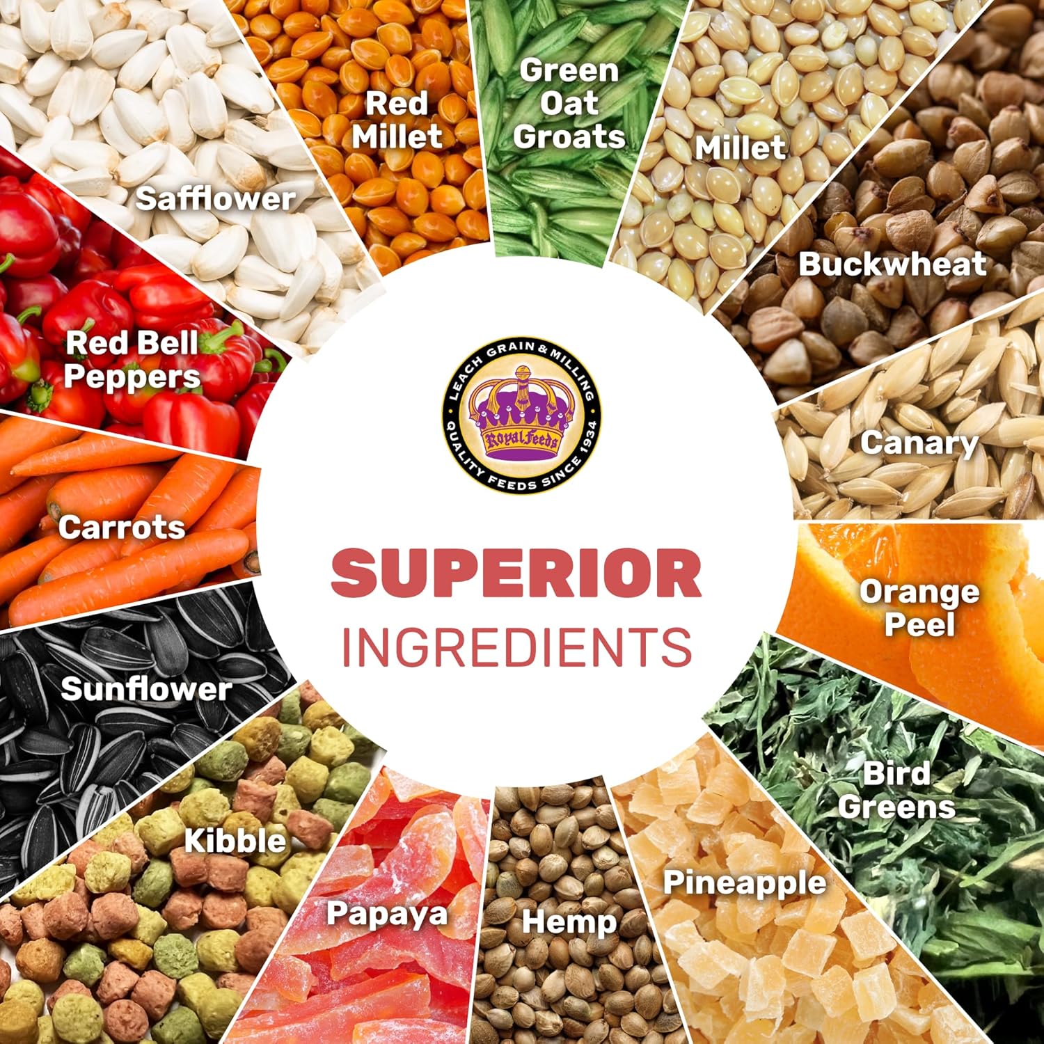 - ππππ ππππ ππππ πππππππππππ β Made with a wholesome mix of top-quality grains, seeds, dried fruits, and vegetables, including canary seeds, millet, sunflower, safflower, papaya, pineapple, red bell peppers, and more. These ingredients closely resemble what birds would eat in the wild, providing them with the variety and nutrition they crave while promoting better digestion, beak strength, and immunity.