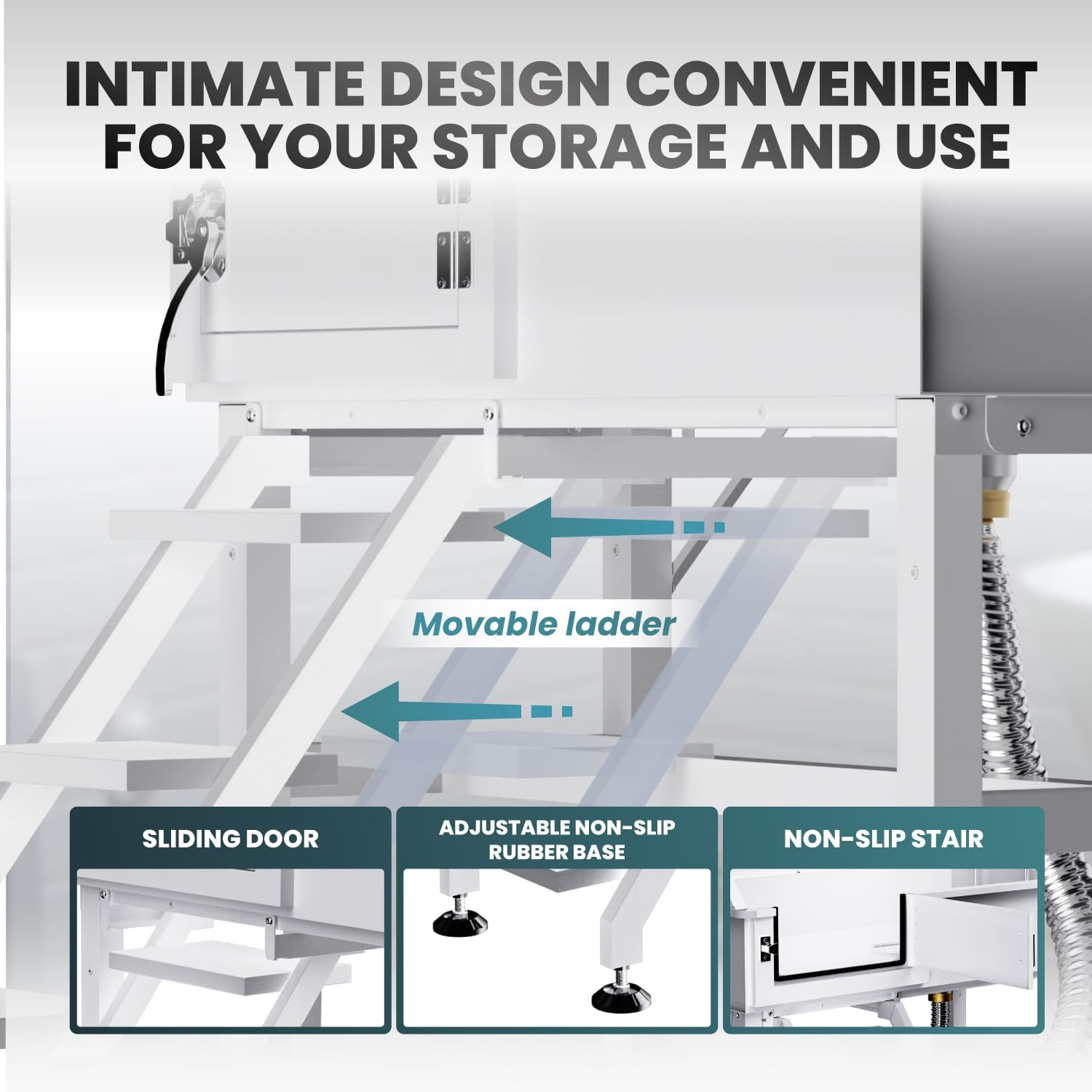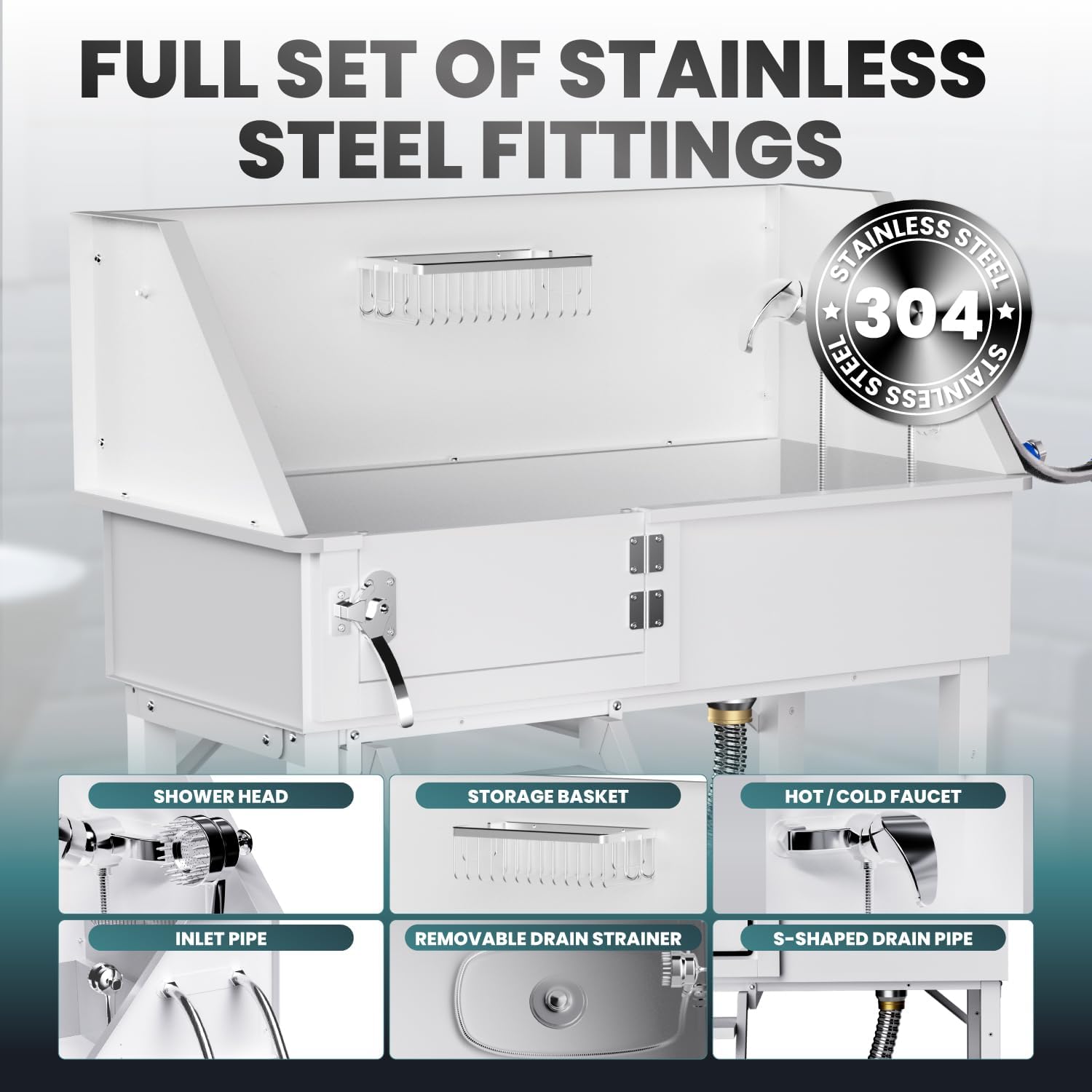 - Perfect Design - The upgraded dog grooming tub with advanced design that make the dog cleaning works more convenient, 1.The bathtub’s shower rack for organized storage, 2.Non-slip stair and adjustable rubber base ensure the safety and stability, 3.Multi-functional faucet for hot and cold water and shower head with comb teeth, 4.Inlet and outlet pipe, S-shaped stainless steel drain pipe for better drainage, A Full Set Grooming Tools At Home!
