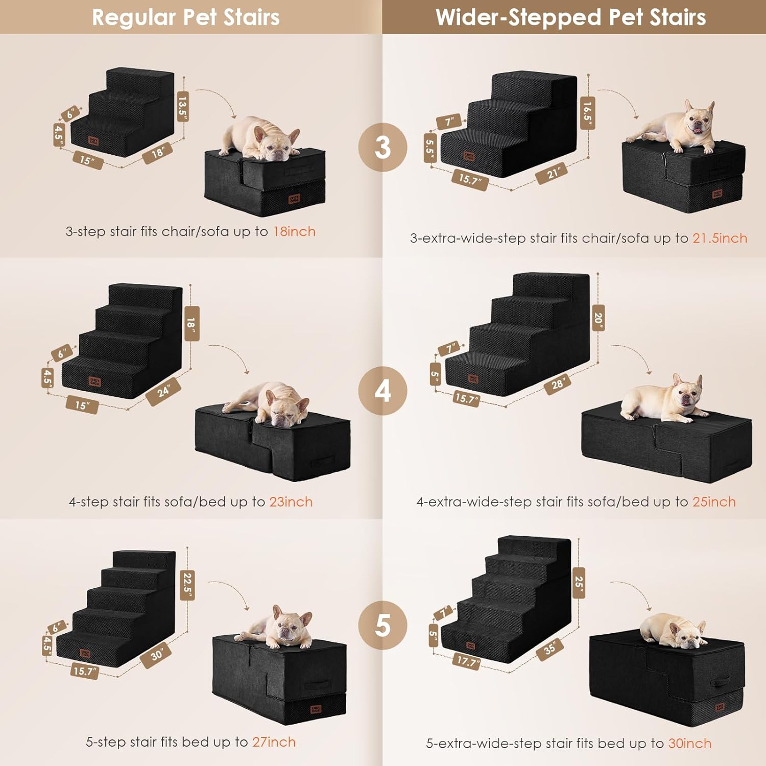 - MULTIPLE STEP SIZES - This dog stair comes in 3, 4, and 5-step options. Our 3-step pet stair is ideal for sofas and low beds (up to 18 inches high), while the 5-step version is better suited for higher beds (up to 27 inches). If your bed is of medium height (up to 23 inches), please select the 4-step one.