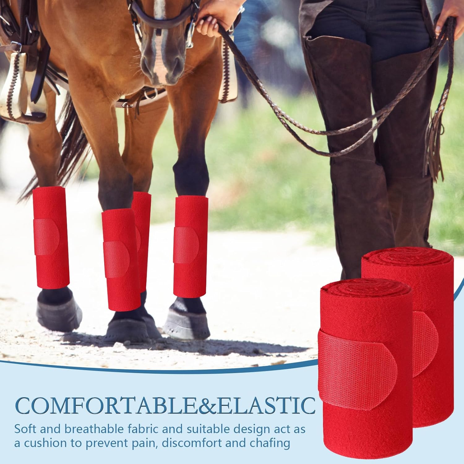 - Sufficient to Use: there is a set of 4 pieces of red horse standing wrap bandages; Your horse's legs can move freely without any restrictions; These standing wraps for horses can helps prevent tendon damage, and keeps horses clean and safe