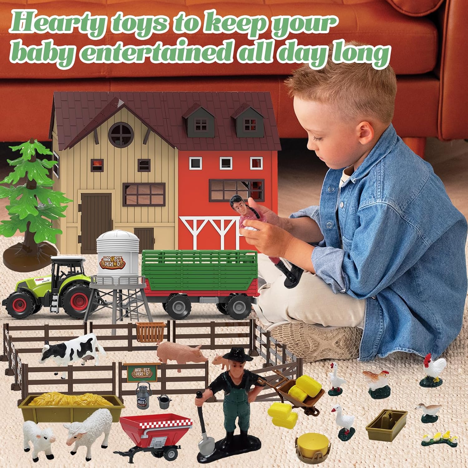 - 【Complete Farm Playset】Comes with 109 pieces including barn, rice storehouse, rice trolley, farmer figure, fences and various farm animals like cows, horses, pigs, chicken, sheep, goose