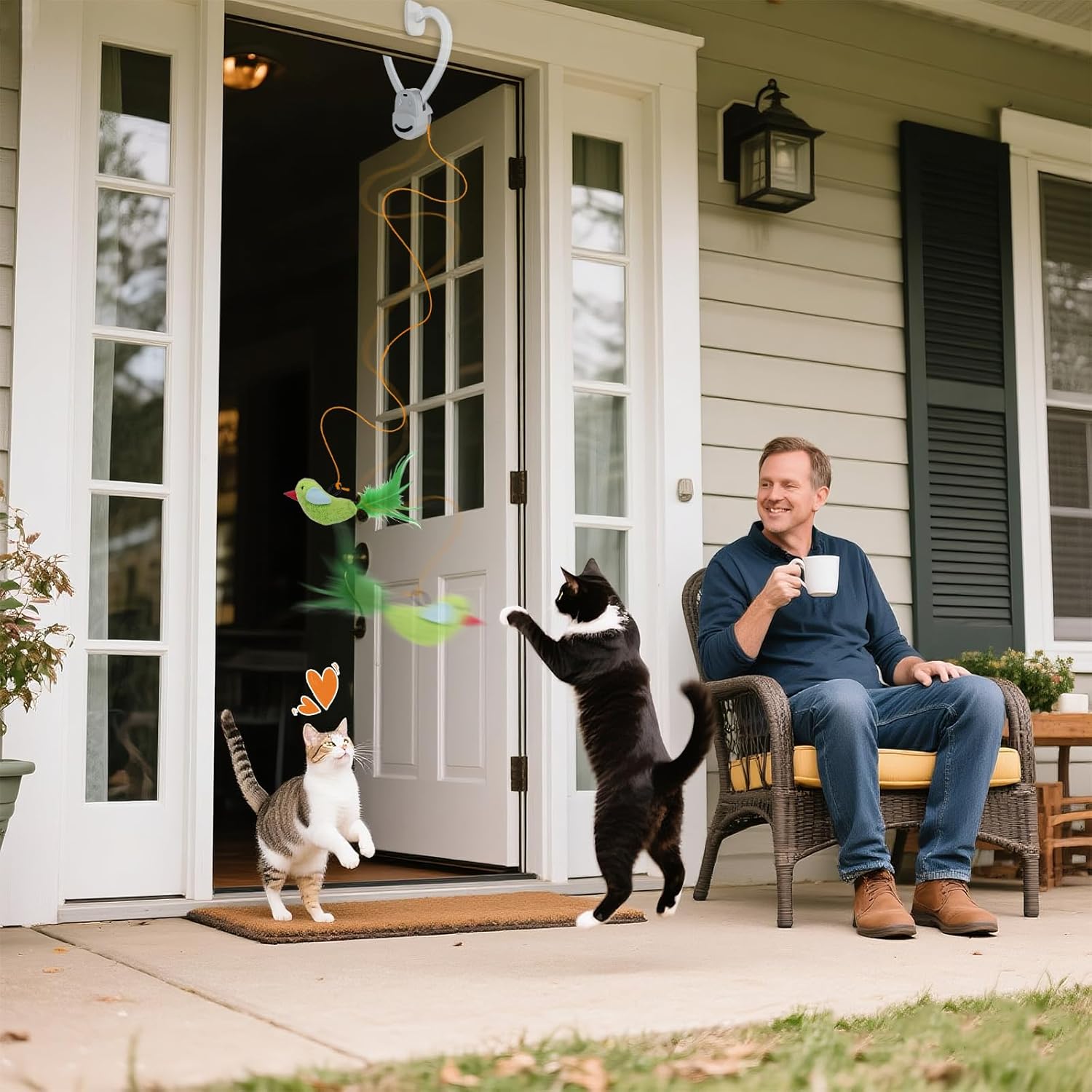 - Cat Doorway Toy Complete Set – Ready to Play Right Out of the Box Includes: ✅ 1x Flying bird Toy for Cats(attracts cats with realistic motion✅ 2x Elastic Strings (adjustable length for different play styles) ✅ 1x USB Charging Cable (convenient rechargeable) ✅ 1x Color Box + User Manual (easy setup)Enrichment for indoor cats perfect for keeping cats entertained.