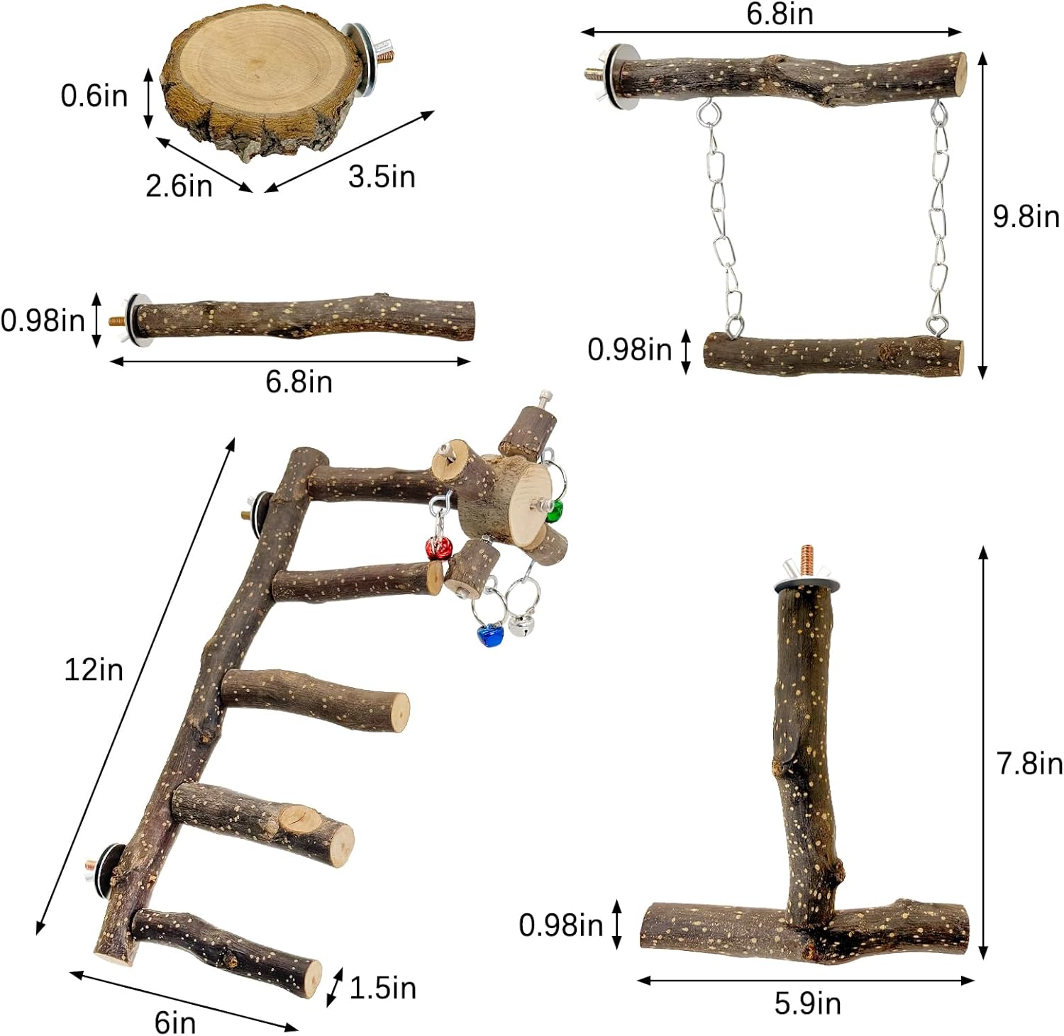 - 6Pack Bird Ladder Perches: Package includes Bird ladder X 1, T Shaped Perch X 1, O Shaped Paltform X 1, Wooden Perch X 2, Bird Swing X1. Design a natural bird habitat with varied perches to support daily rest, play, and instinctive behaviors