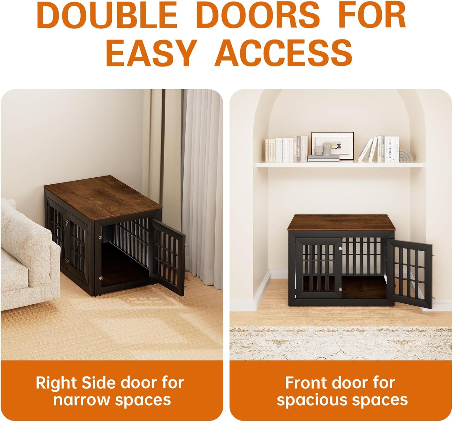 - 【Double Doors Design】The dog kennel furniture has a front door and a side door, your pet will go in and out easily with double doors. The double-doors design can adapt to more different space environments. You can decide whether to open the front door or the side door according to your needs.