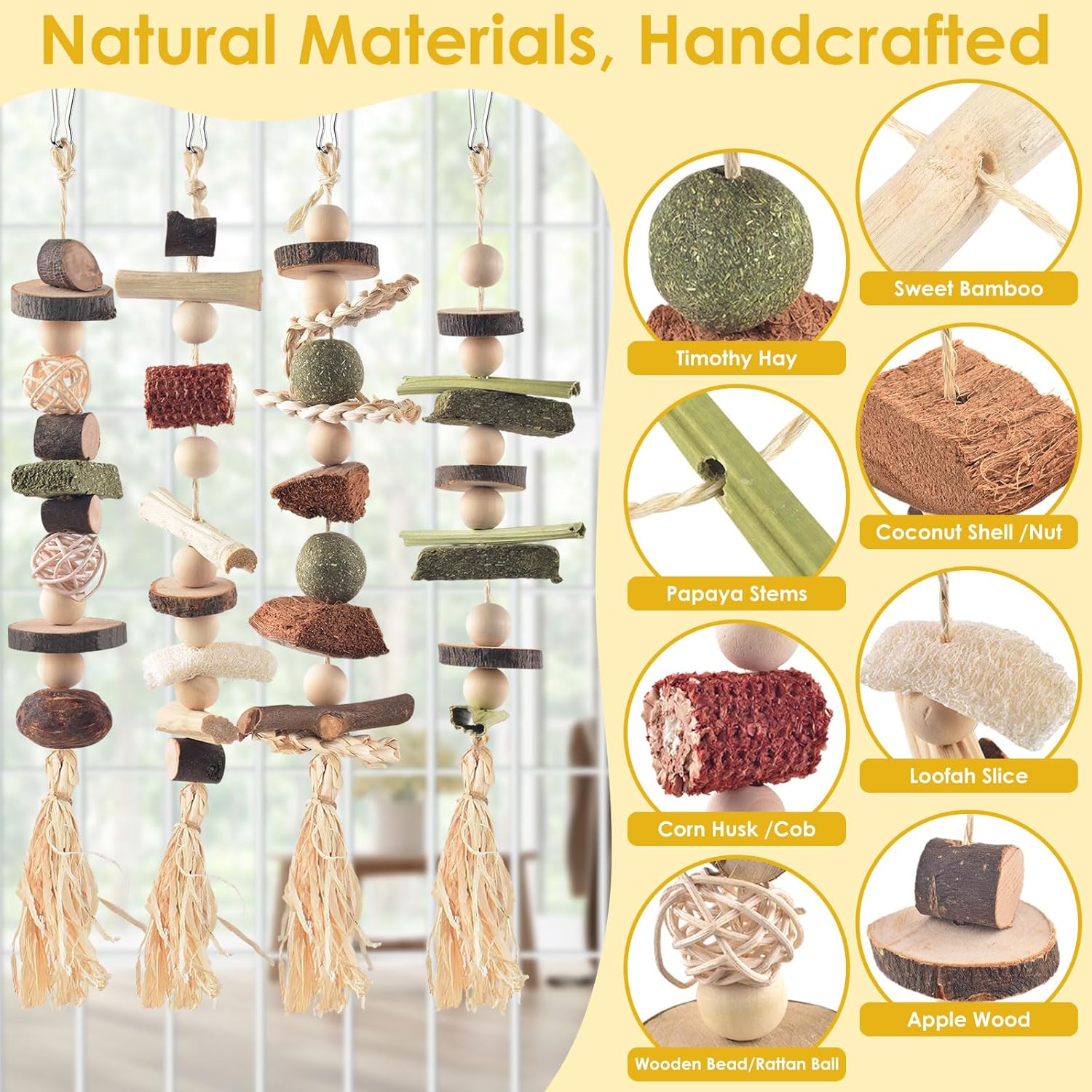 4 Pcs Bunny Chew Toys for Teeth, Hanging Rabbit Chewing Toy Treats with Timothy Grass & Natural Apple Wood, Improve Small Rodent Dental Health for Guinea Pig Hamster Chinchilla Rat Gerbil