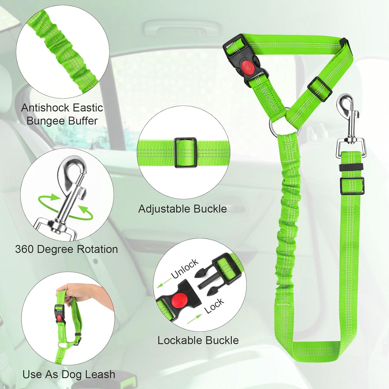 - Durable&Practical: Made of durable nylon fabric to ensure safety, features the solid zinc alloy swivel snap,elastic bungee and high-quality buckles, The reflective stitching design makes it great for night time use. The elastic bungee helps dog prevent jerking with sudden movement. the pet car seat belt ensures the safest traveling for your pet, and provides a most relaxing driving experience for you